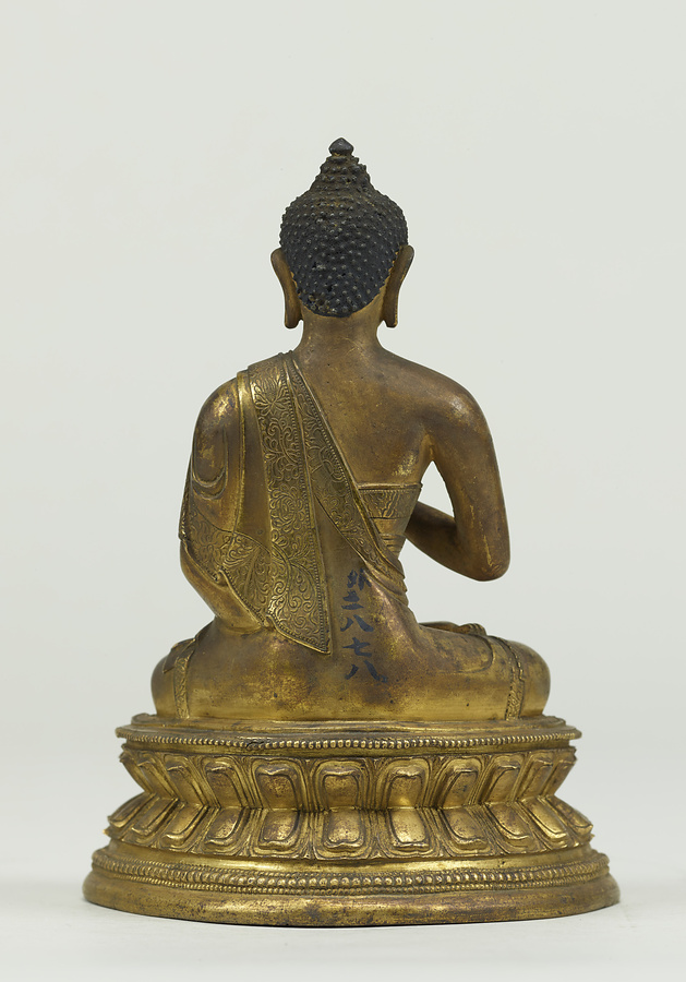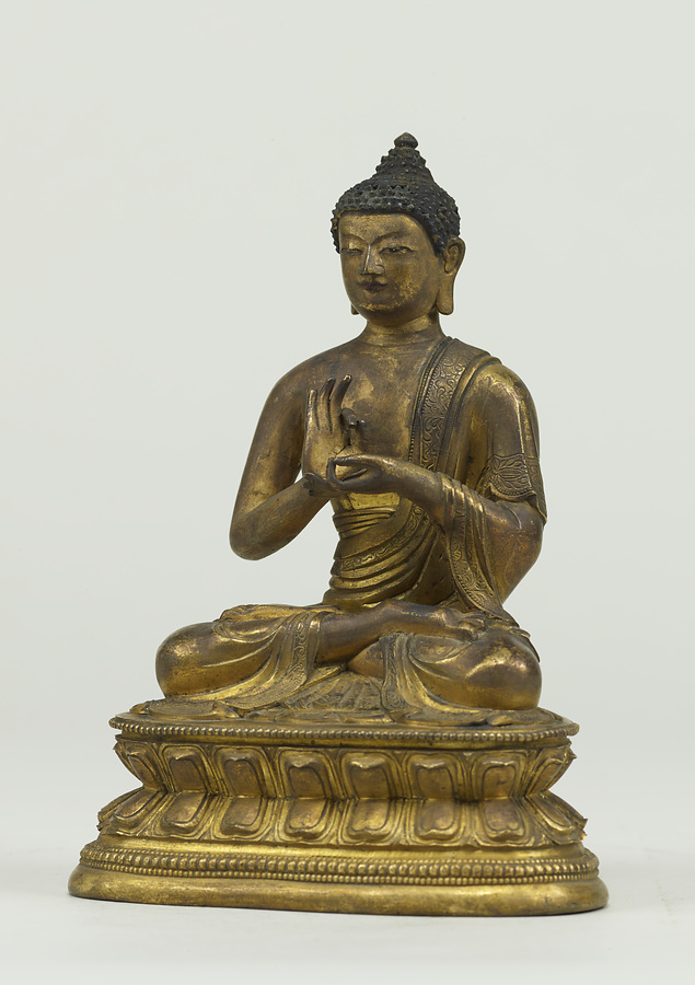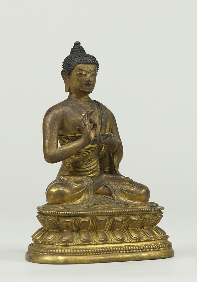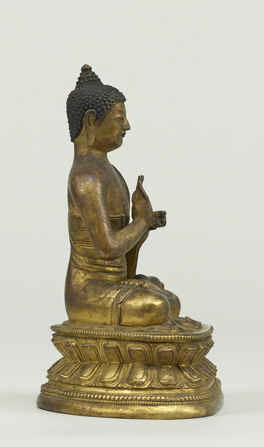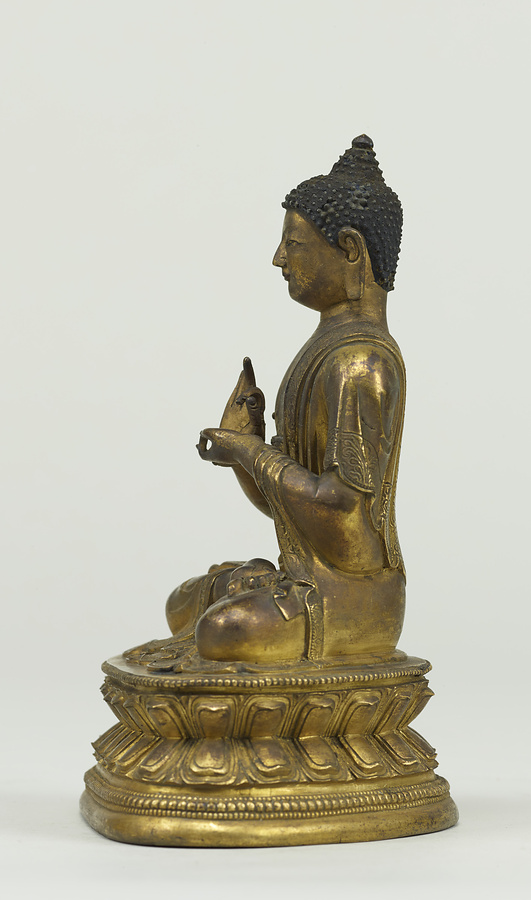 TC-213、212、223とあわせて、着衣や台座の形式が一致するため、七仏薬師として造られたとみられます。右手を胸前に構え、左手をこれに寄せて仰ぐ、転法輪印という説法を行なう仕草から、金色宝光妙行成就如来あるいは法海雷音如来である可能性が考えられます。