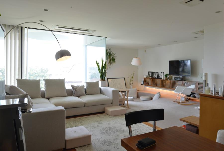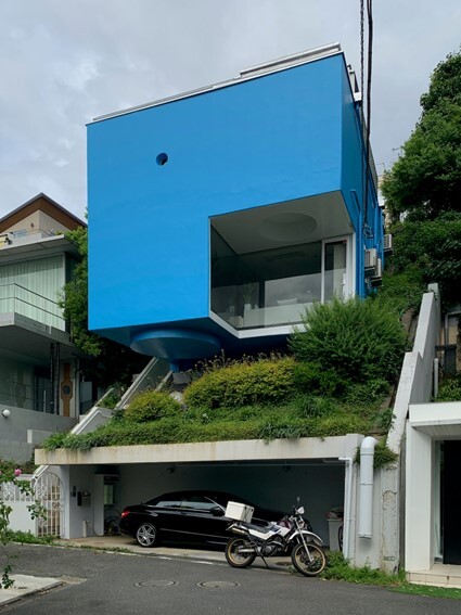 世田谷の国分寺崖線に建つ住宅。鉄筋コンクリート造及び木造の混構造で設計は宮脇檀。崖に浮かぶ青色の閉鎖的な箱内部は、上階の庭からガラスで囲った階段室に光を導き、明るい住環境を達成。地形を巧みに用いた独創的な住宅で宮脇檀の革新的作品として貴重。