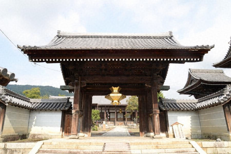 本堂の西方で参道に開く一間一戸の四脚門。切妻造桟瓦葺で、本柱は円柱、袖柱は角柱とし、腰貫、飛貫、頭貫で固める。組物は支輪を備えた出組、軒は二軒繁垂木とする。飛貫と頭貫の木鼻を彫刻で飾った華やかな山門で、伽藍と宿場の町並みの歴史的景観を構成。