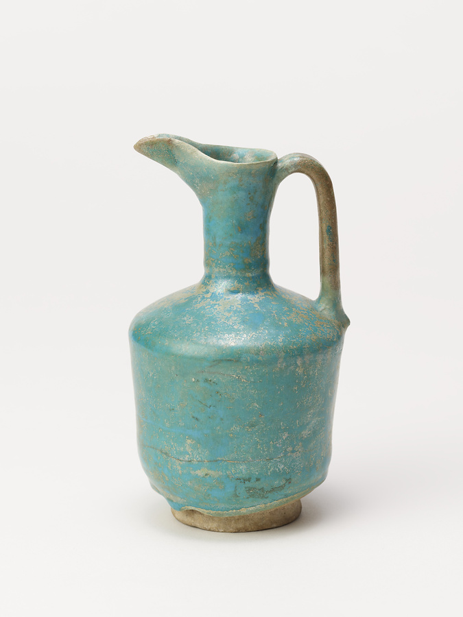 灰褐色の胎土を用い、美しいトルコアーズ・ブルーの青釉を施す。美しく明るいトルコ石色釉薬の発色は、アルカリ釉と酸化炎焼成した銅から生まれる、イスラーム陶器特有の色で、錫が混じっているために不透明釉となっている。少し広がりながら立ち上がる12面の胴部に、少し広がり気味に伸びる頸部が付き、その一端を屈曲させて注口としている。肩部と口縁部を細い取手が繋いでおり、高台が附属している。外面は高台近くまで、また内部全面に厚く青釉が施されている。釉薬に粘り気があり、底部付近には釉だまりが認められる。釉は一部銀化(風化)しており、なかでも取手部分に集中して見られる。