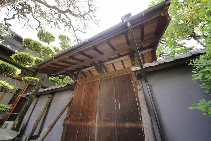 医家の屋敷内で敷地の玄関側と座敷側を隔てる塀と、それに開く門。切妻造銅板葺の腕木門で、軒は疎垂木、扉は舞良戸を建てる。塀は桟瓦葺、真壁造鼠漆喰仕上で、通り沿いの塀の裏側と仕様を揃え接続する。旧家の屋敷内の落ち着きある接客空間を形成する。