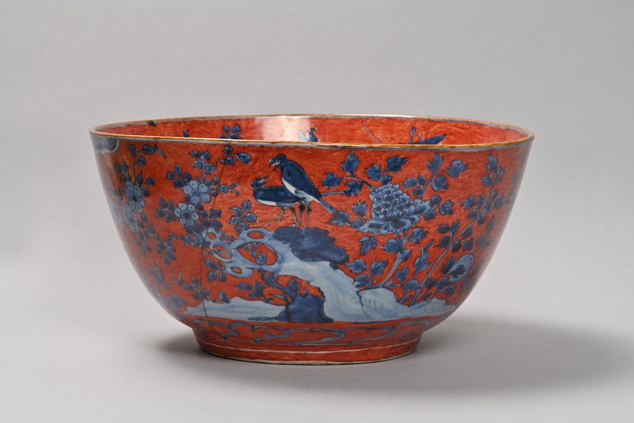 紅地青花花鳥文鉢
