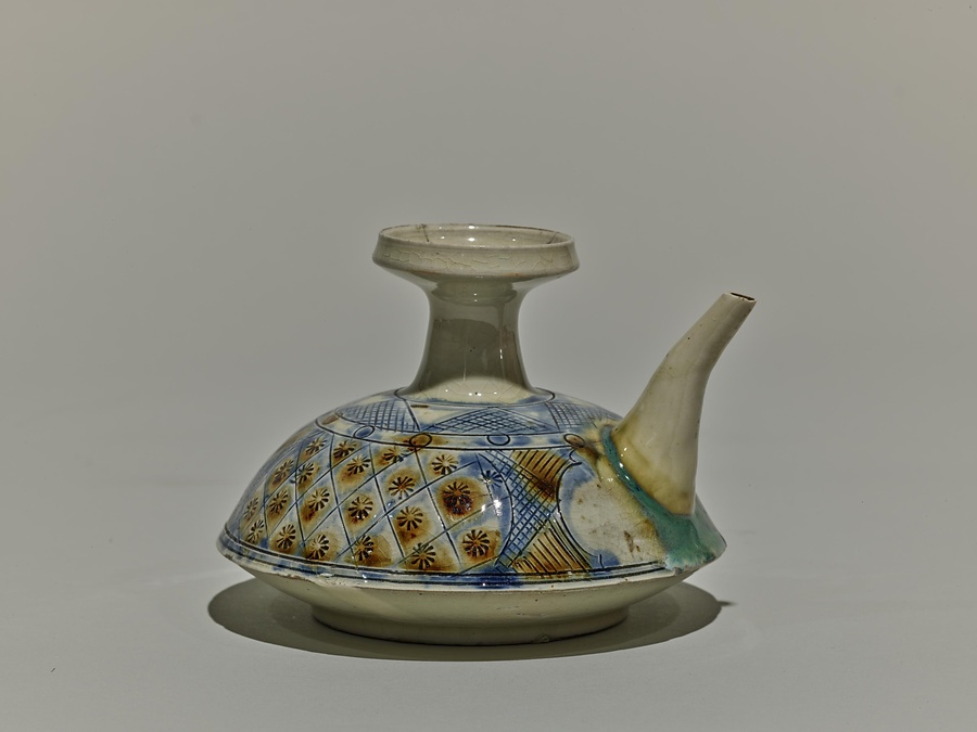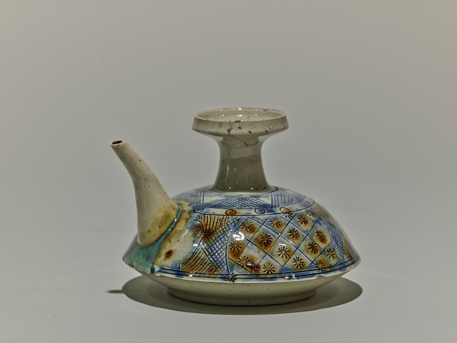 腰が横に広く張る変わった形の酒器で、薩摩焼にも知られています。「カラカラ」の名は、中に陶丸があって空になると鈴のように鳴る、とか「貸して貸して」の方言に由来するなどの説があります。線刻と印花、そして藍、褐、緑の三つの色釉が目に楽しい一品です。