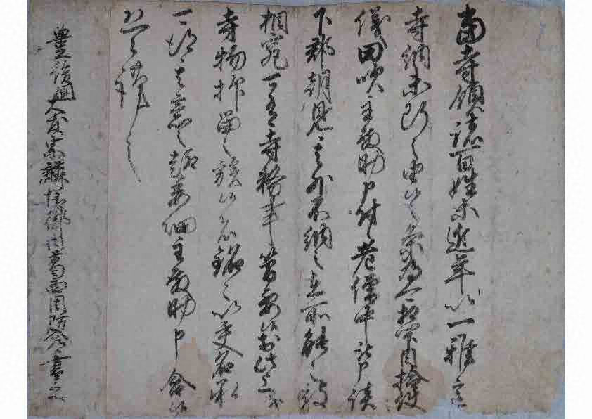 本史料は日付や差出人・宛所が切られてはいるが、その内容や言葉、人名、地名等から大友氏から万寿寺へ出された書状とみられる。文面から万寿寺の寺領経営に大友氏が検使を派遣するなどして関与していたことが分かる史料である。
