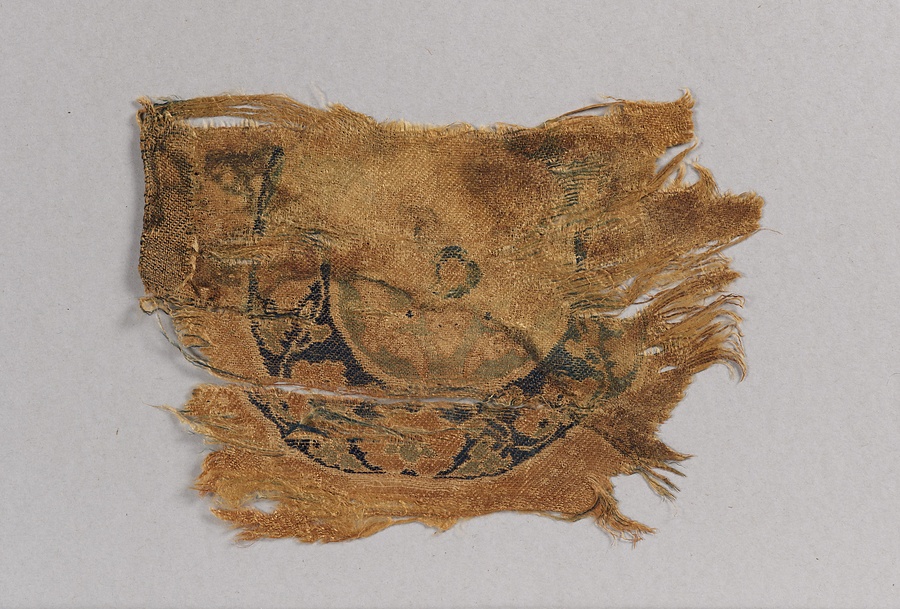 中国・遼代の墳墓から出土したと思われる錦裂。遼代の染織品は遺例が少なく貴重である。中国ではこの種の織組織を「遼式斜紋緯錦」と呼称している。これは、遼墓から複数遺例が見つかっていることによる。この種の錦は、西夏の黒水城遺跡など遼周辺地域からも類例が出土している。黒水城遺跡出土の幡裂は、京都・神護寺伝来の一切経の経帙に使用される錦と文様が類似し、また織組織が共通する。これにより、近年、これまで平安時代の作であると考えられてきた錦が舶載裂であることが指摘されるようになった。平安時代の染織品や、遼や西夏と同時期に存在した漢民族国家・北宋の染織品は残存数が少なく、9-12世紀の染織品の全容や流通経路は解明されていない。遼代染織品はこれらの問題を解決する手がかりとなる貴重な作例である。本作は海東青を用いた丸文をあらわした錦裂。連珠を伴った菱文を地文にあしらう。海東青丸文の周囲は、花唐草文の帯で括る。ボタン花様をした花唐草文様の初期の例としても貴重である。