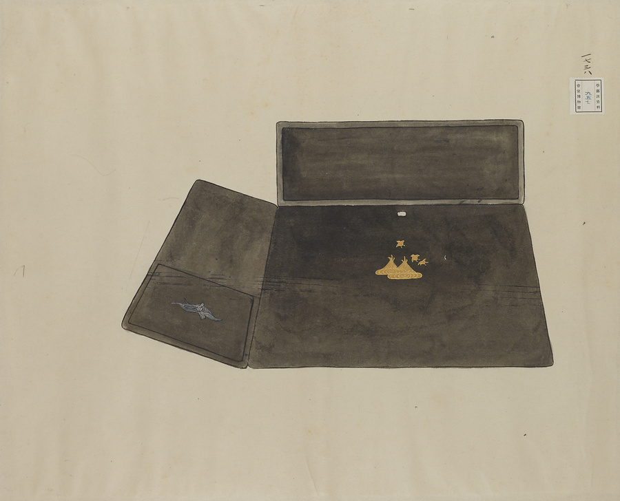 郷土玩具(きょうどがんぐ)の研究者で収集家でもあった清水清風(しみずせいふう)から出品された枕。立体物を平面に描くため、一部を展開図のようにして描いた工夫が見られる。