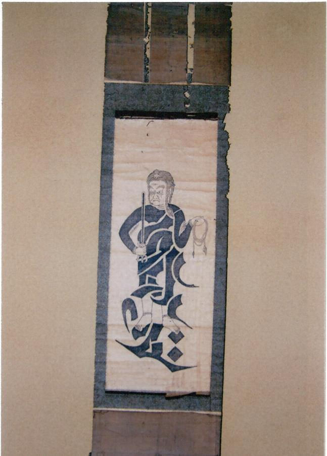 本「かんまん不動掛軸」は、山内花祭りの鍵取り屡敷として代々花太夫をつとめてきた榊原家に伝来した絵画史料である。花祭りは江戸初期(寛永~寛文年間)に大神楽を薄編成して創出された霜月神楽であるが、これまで花祭り創出の経緯、時期、榊原家に創始者など不明な部分が多く、とくに創出者については、修験者であることが史料と伝承によって確認されてきたが、それ以外に実証資・史料がなく、花祭り創出者の研究を阻んできた。