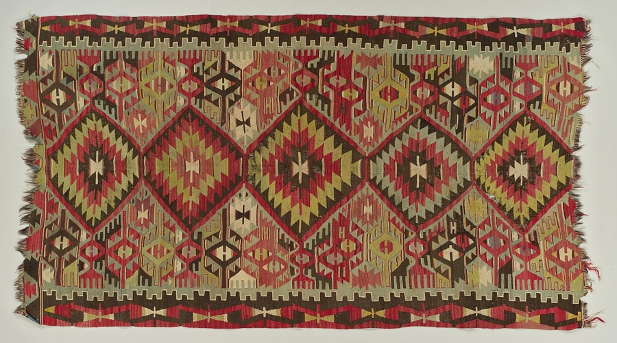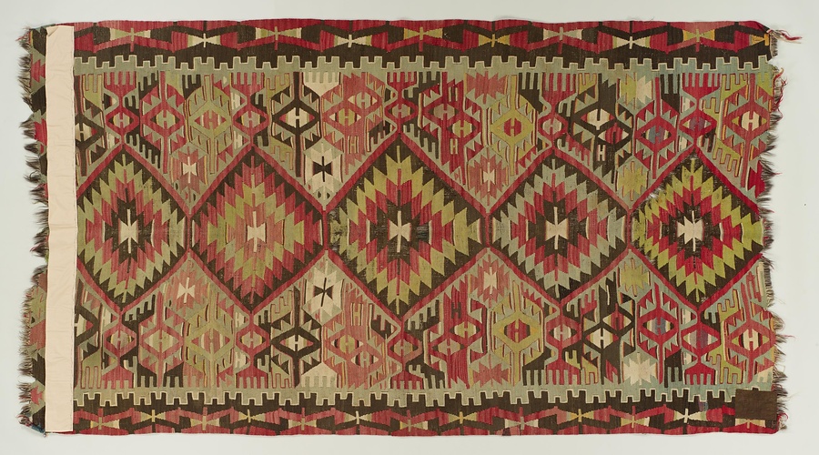 敷物 黒地段幾何文様綴織・スマック織・パイル織