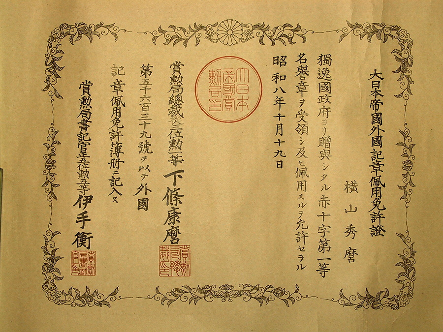 大日本帝国外国勲章佩免許證