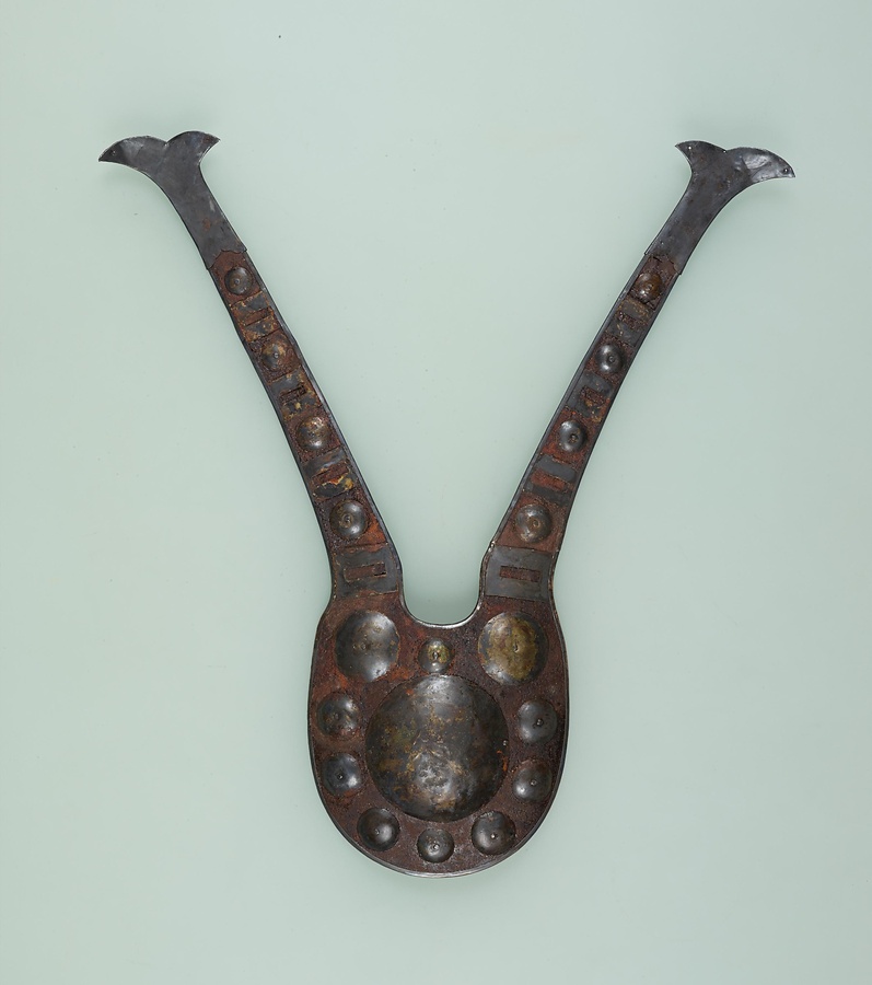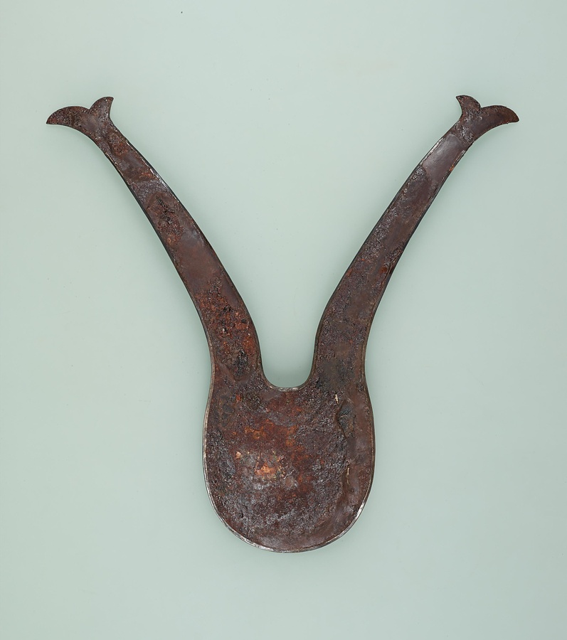 アイヌ語でペラウシトミカムイ<へらをお持ちになる宝の神さま>などといわれる。古い兜の鍬形を模したもので病気をなおす呪具として用いられた。山の洞窟に秘匿されたり、地中深く埋められたりしたため伝世するものはない。本資料も偶然に畑から発掘された。