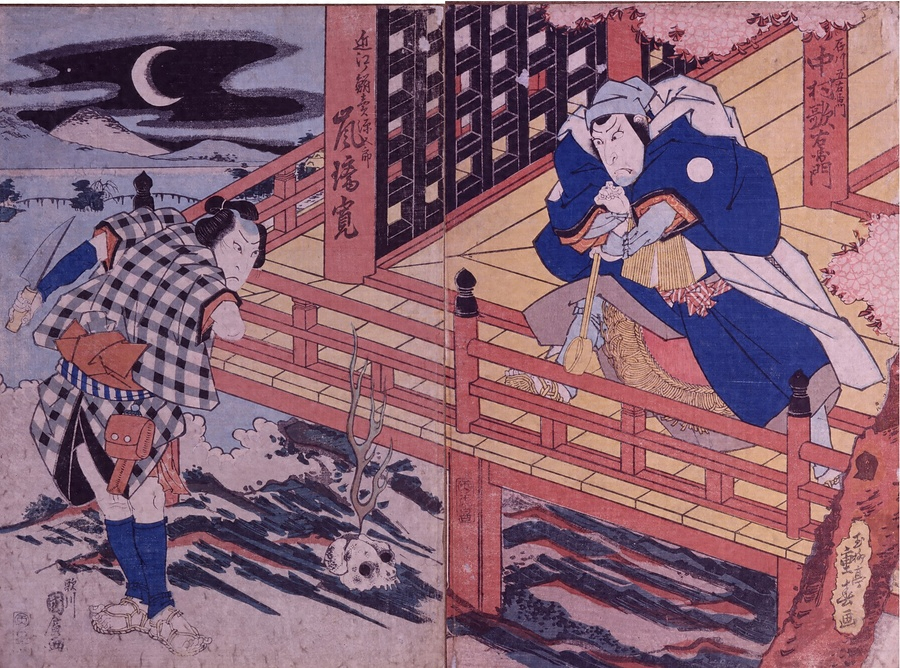 歌右衛門と先代璃寛(初代嵐橘三郎)は文化文政期を代表する役者として人気を二分していたが、長らく共演することがないまま橘三郎が文政4年に亡くなった。歌右衛門は翌年の二代目橘三郎(璃寛)襲名に尽力するが、同12年7月まで、この二人が共演することはなかった。本作はその二人が初めて二の替興行で共演したときの役者絵である。重春と師の国広による合作で、月夜の中で対峙する二人からは、華やかともいえる意気地が見て取れる。