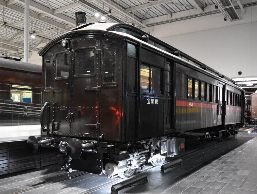 蒸気動車は客車の片側に蒸気機関の動力機構を備えた車輌である。本車輌は現存唯一の国産蒸気動車で、工藤兵治郎の考案になる。動力機構は蒸気機関車とほぼ同様で、取扱・保守点検に工夫が凝らされ、関西・九州方面で小規模・短距離の輸送に貢献した。