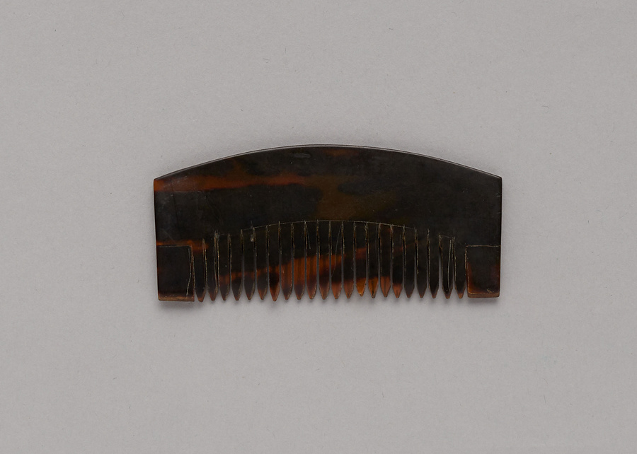 鼈甲製、町形のやや小ぶりな挿櫛である。町形の形状は、京都で宝暦9年(1759)に刊行された『圖式雛形/蒔繪大全』に図示され、また江戸では高原形とも呼ばれて明和・安永期(1764~1781)に流行したともされる。鼈甲櫛は舶載の高級品で大ぶりなものが好まれたが、『玳瑁亀圖説』によると文政8年(1825)頃から小型化が始まった。黒斑の部分が使われている。花柳章太郎(1894~1965)の旧蔵品で平成15年(2003)に遺族の青山久仁子氏より国立劇場へ寄贈された。