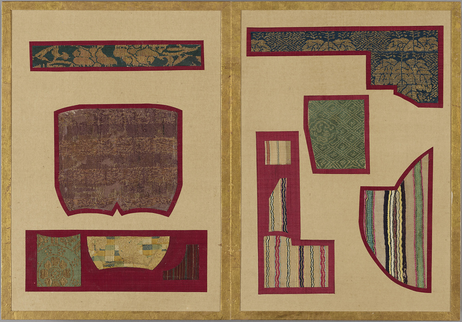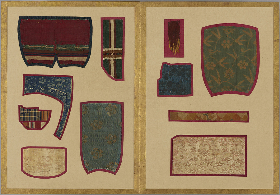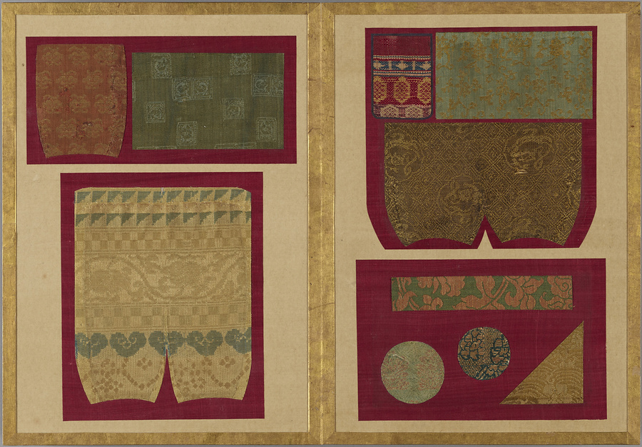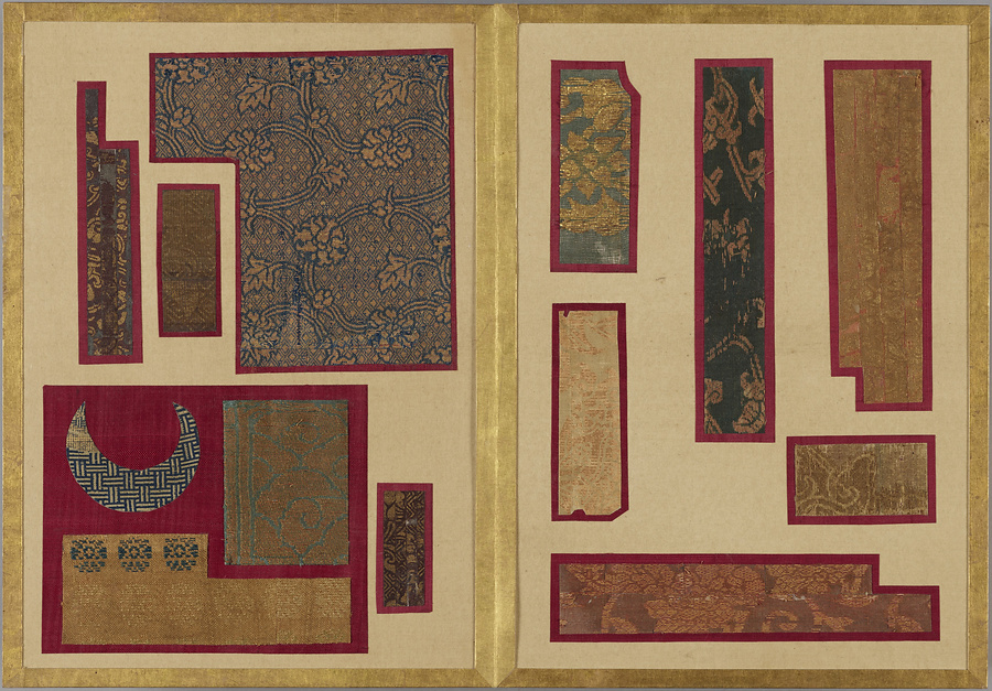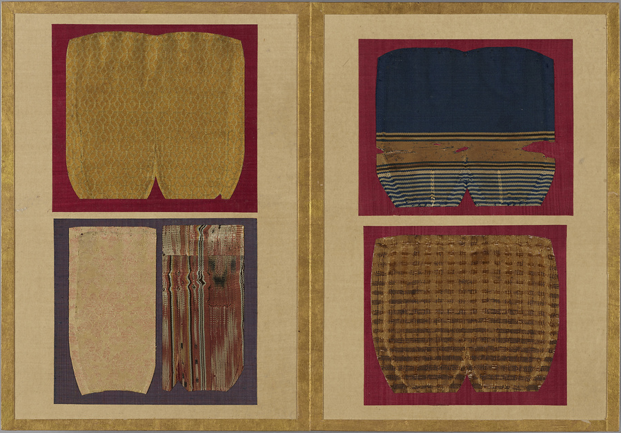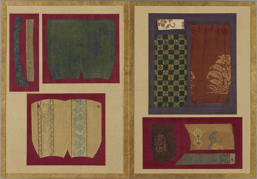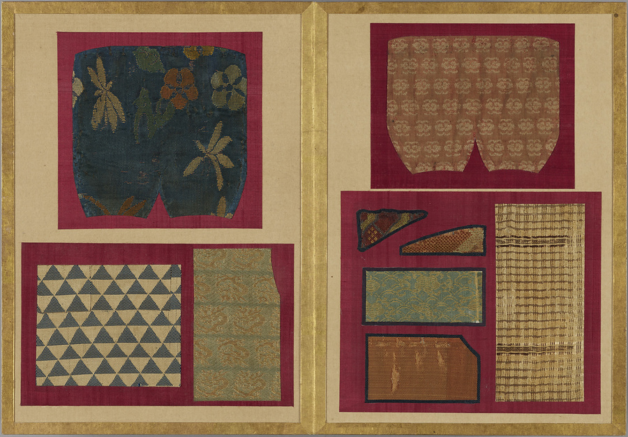 千家御用の袋師・土田家蒐集と伝わる裂を貼り集めた折本仕立の裂帖。箱の印より、近代数寄者として知られる益田孝(鈍翁、1848-1938)の妾、益田多喜子(紫明庵)旧蔵であることがわかる。千家御用の袋師蒐集品にふさわしく、蜀江錦や臈纈染めなどの上代裂から、16世紀ごろまでの古裂の名品が含まれる。所収裂は「冨田」、「鶏頭」、「角之倉」、「嵯峨桐」など号を冠する名物が揃う。13世紀頃まで製作時期が上る「大燈金襴」や「二人静」も含まれており、大変貴重な手鑑。装丁も美しく、鑑賞を目的として作られた裂帖の好例である。また付属の目録には図入りで裂の名称とそれぞれの解説が記されており史料性も高い。