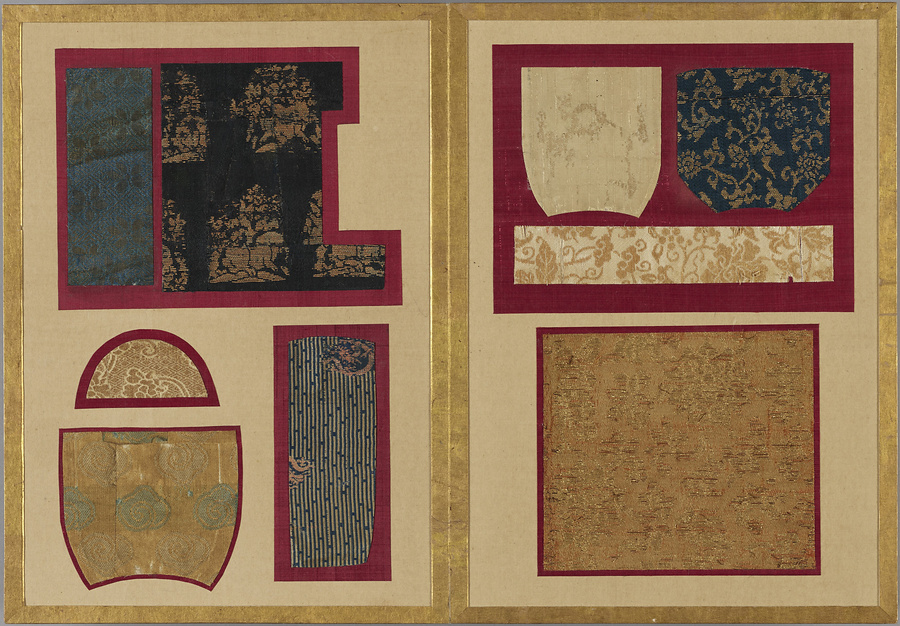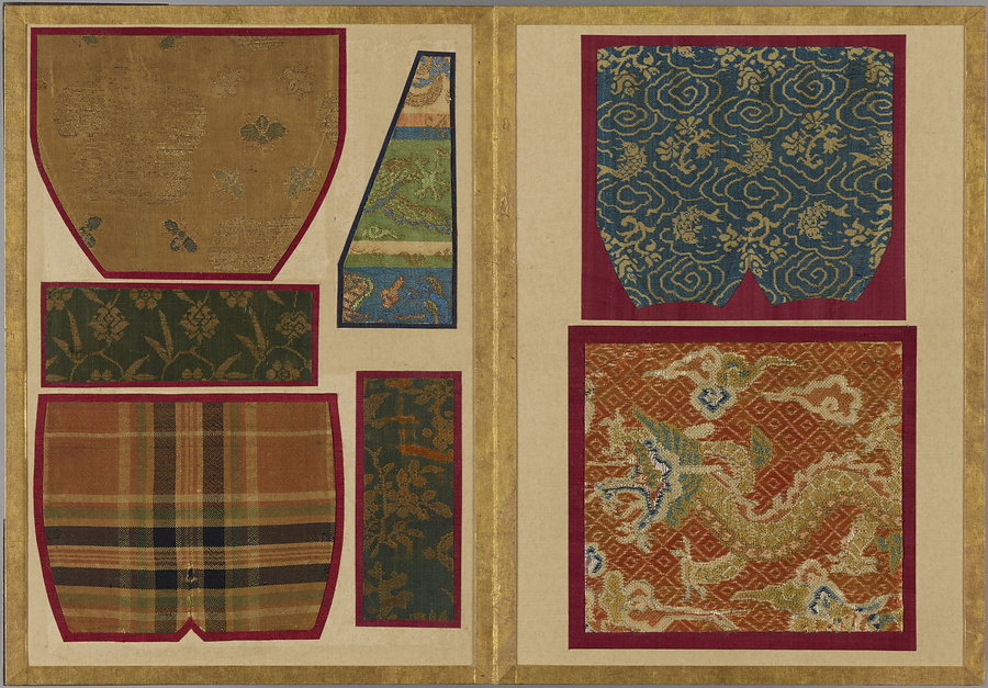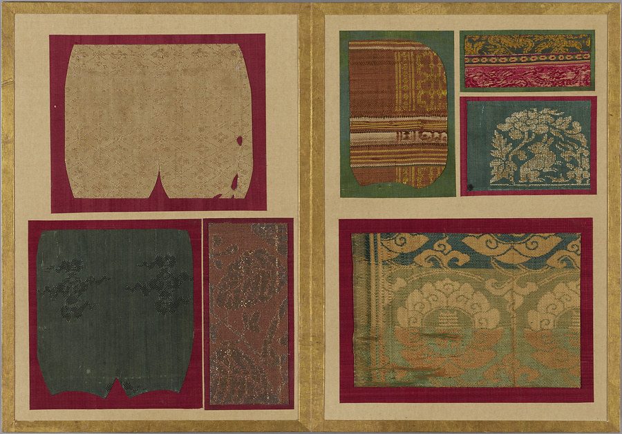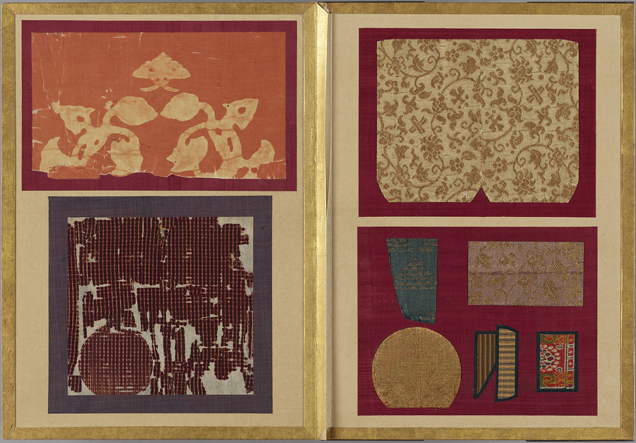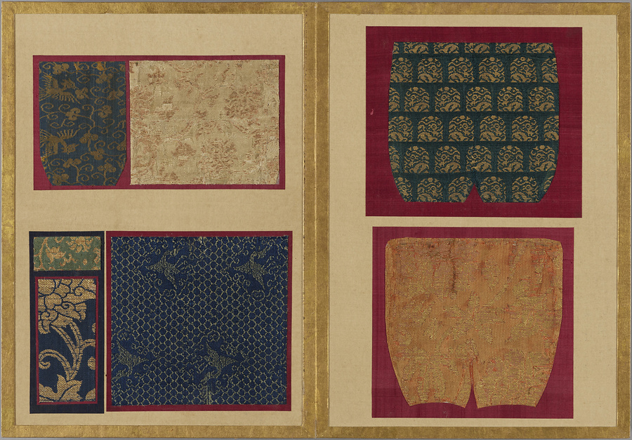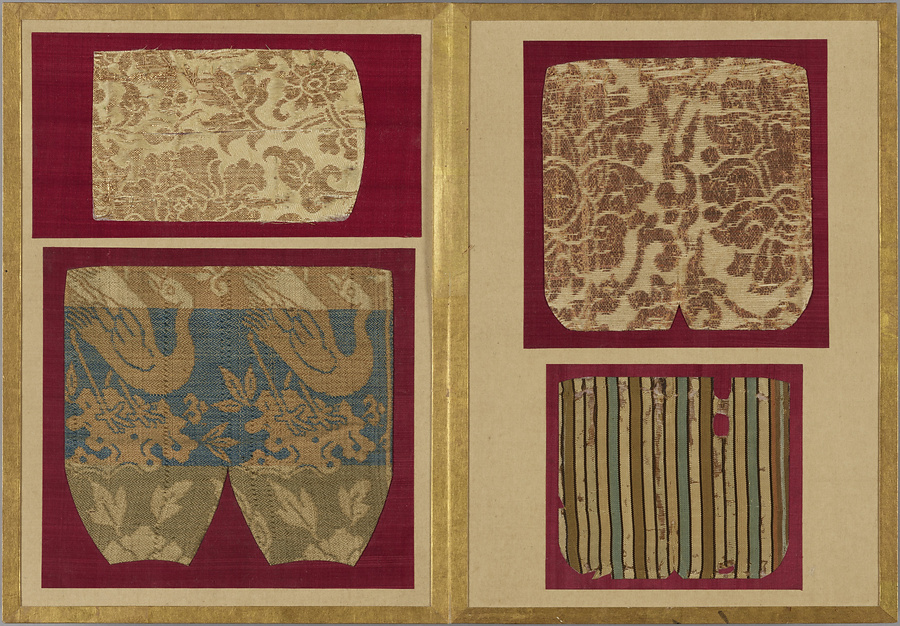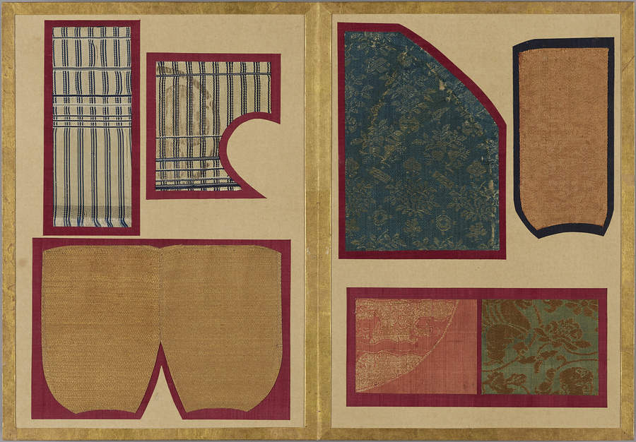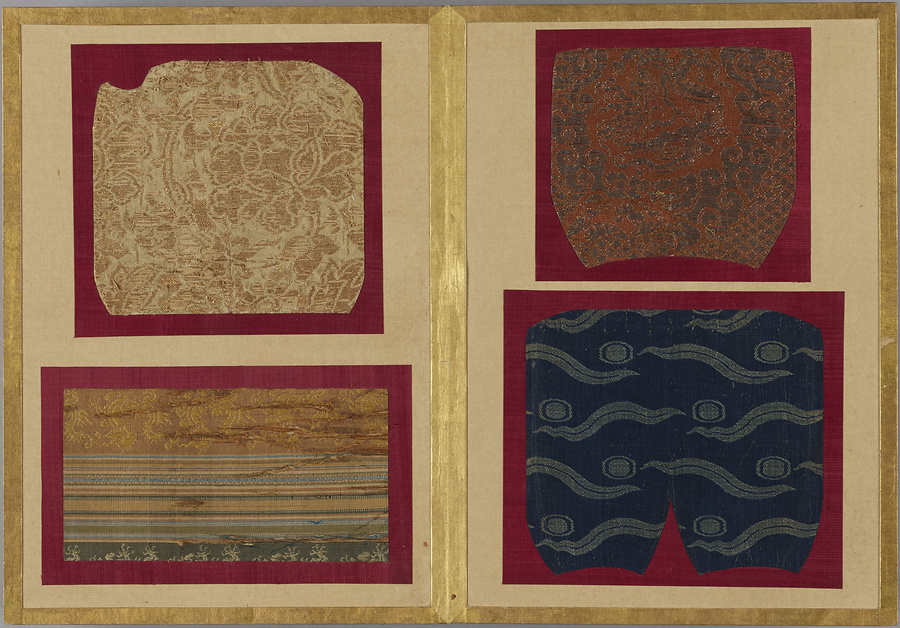 千家御用の袋師・土田家蒐集と伝わる裂を貼り集めた折本仕立の裂帖。箱の印より、近代数寄者として知られる益田孝(鈍翁、1848-1938)の妾、益田多喜子(紫明庵)旧蔵であることがわかる。千家御用の袋師蒐集品にふさわしく、蜀江錦や臈纈染めなどの上代裂から、16世紀ごろまでの古裂の名品が含まれる。所収裂は「冨田」、「鶏頭」、「角之倉」、「嵯峨桐」など号を冠する名物が揃う。13世紀頃まで製作時期が上る「大燈金襴」や「二人静」も含まれており、大変貴重な手鑑。装丁も美しく、鑑賞を目的として作られた裂帖の好例である。また付属の目録には図入りで裂の名称とそれぞれの解説が記されており史料性も高い。