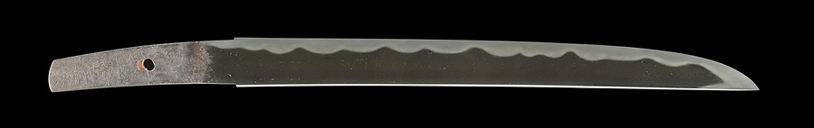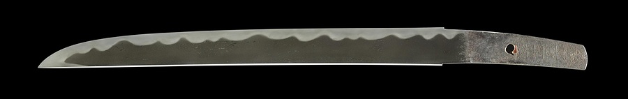 長(なが)義(よし(ちょうぎ))は南北朝時代に活躍した備前国(岡山県東南部)・長船派(おさふねは)の刀工です。備前鍛冶には珍しく、沸(にえ)と呼ばれる刃文(はもん)を構成する粒子が目立った力強い作風となります。これは地沸(じにえ)のついた地鉄(じがね)、沸がついたの(・)た(・)れ(・)刃(ば)の刃文(はもん)など長義の典型的な作風が示され、製作年も明らかで貴重です。