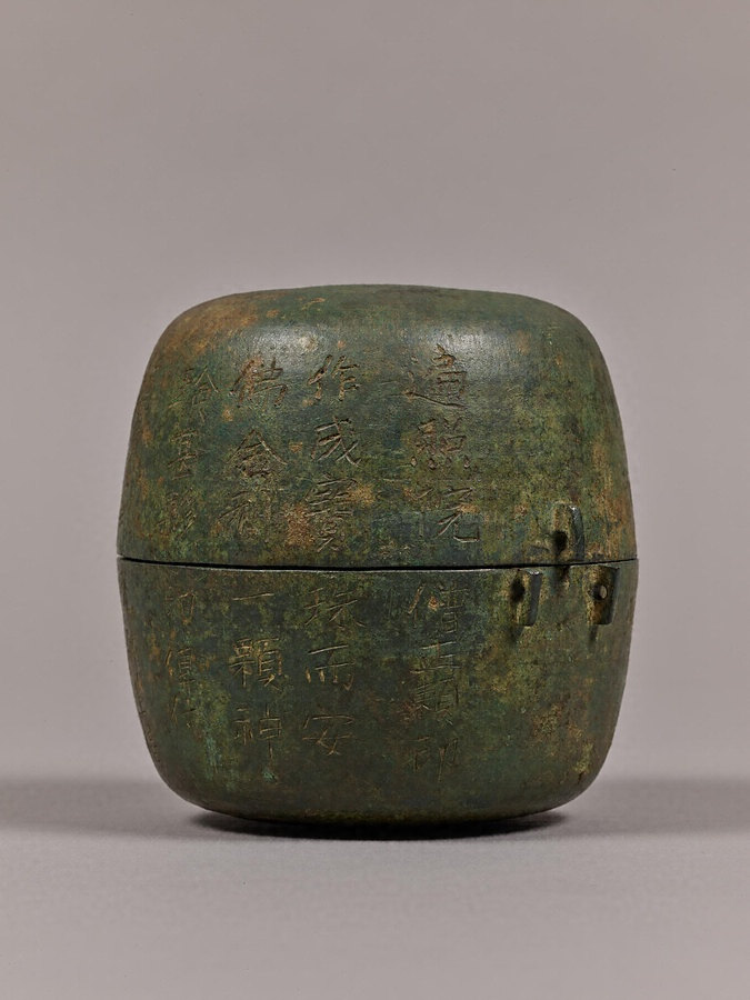 銅鋳造で厚手に造った蓋と身からなる。全面にわたって銘文が刻まれており、遍照院僧正(へんしょういんそうじょう)の頼印(らいいん)が宝珠を作り、それに仏舎利一粒を納めていたと記している。この記述は、空海が自ら宝珠を作り、それを舎利と同体とみなしていた信仰(能作生珠(そうさしょうしゅ))を想起させる。