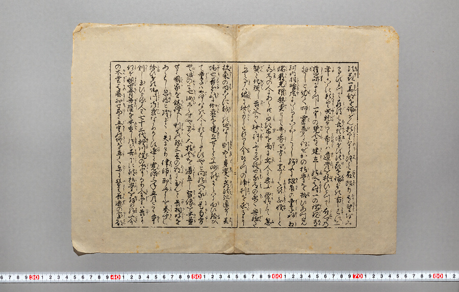 松原市北新町2丁目あたりに所在した布忍山永興寺の略縁起を記した木版刷。寛治3年(1089)に永興律師が堀川天皇の勅願により寺院を建立したことが記されており、元文2年(1737)に本縁起を基に新たに製作されたものである。4丁とも綴じ穴がなく未製本の状態である。刊記などがなく、刷られた時期は不明。