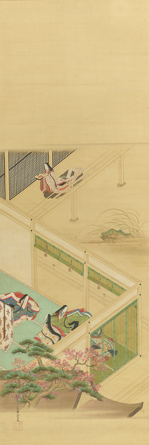 右幅は雛遊びに熱中する紫の上と源氏の姿を描く第7帖〈紅葉賀【もみじのが】〉。左幅は源氏が造営した六条院で、秋の対に住む秋好中宮【あきこのむちゅうぐう】が、庭先の色とりどりの紅葉を女童【めのわらわ】に持たせ、春の対に住む紫の上に贈る場面を描く第21帖〈乙女(少女)〉。住吉家と板谷家の共作。
