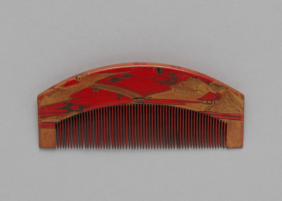 木製、京丸形、丸棟の挿櫛。京丸形は『玳瑁亀圖説』によれば、京都で流行の形を江戸で模して天保年間(1830~44)に流行して「横三寸三分」が標準とされる。赤口の朱漆塗に櫛歯を残して金地とし、漆絵と平蒔絵で富士と山水を表す。花柳章太郎(1894~1965)の旧蔵品で平成15年(2003)に遺族の青山久仁子氏より国立劇場へ寄贈された。