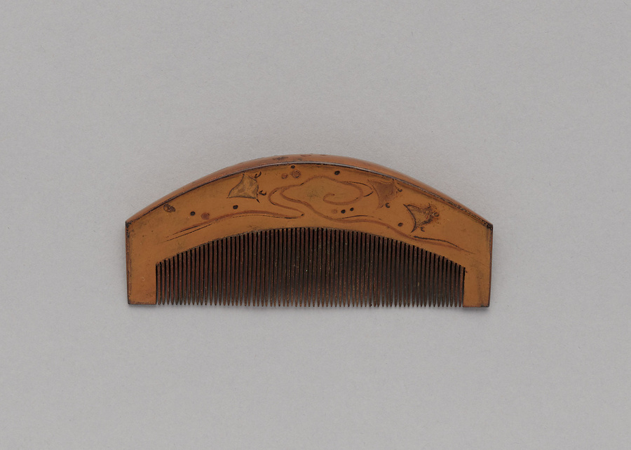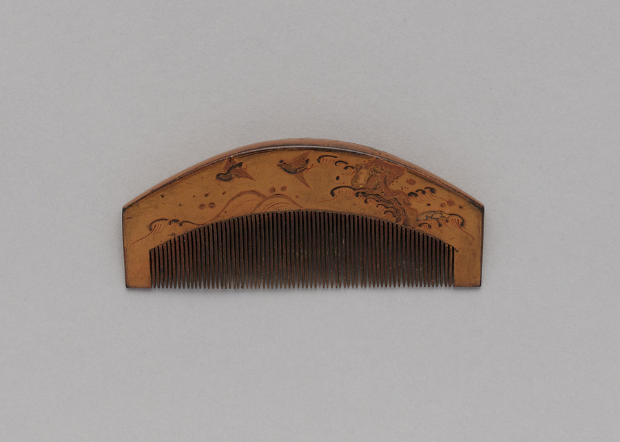 柞製の利休形、角棟の挿櫛である。利休形は、『玳瑁亀圖説』によると江戸で寛延・宝暦頃(1748~1764)に大ぶりなものが流行して文化初年までは大きかったが、文政8年(1825)以降に櫛が小型化する中で小ぶりな利休形が流行したとされる。櫛歯を残して金粉溜地(きんふんだみじ)とし、岩、波に千鳥を高蒔絵で表す。花柳章太郎(1894~1965)の旧蔵品で平成15年(2003)に遺族の青山久仁子氏より国立劇場へ寄贈された。