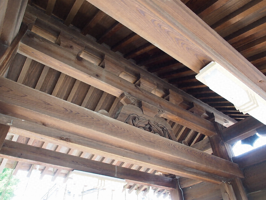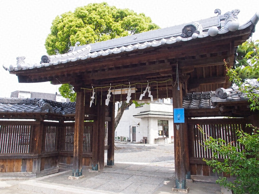 境内南端、参道正面に建つ一間一戸の四脚門。柱は面取角柱とし、本柱を繋ぐ冠木上に巻斗を並べて棟木を支える。控柱は頭貫で繋ぎ、大斗肘木を載せる。軒は一軒疎垂木。袖塀は連子格子で腰板壁とする。整った意匠をもつ神門で袖塀とともに境内の景観をつくる。
