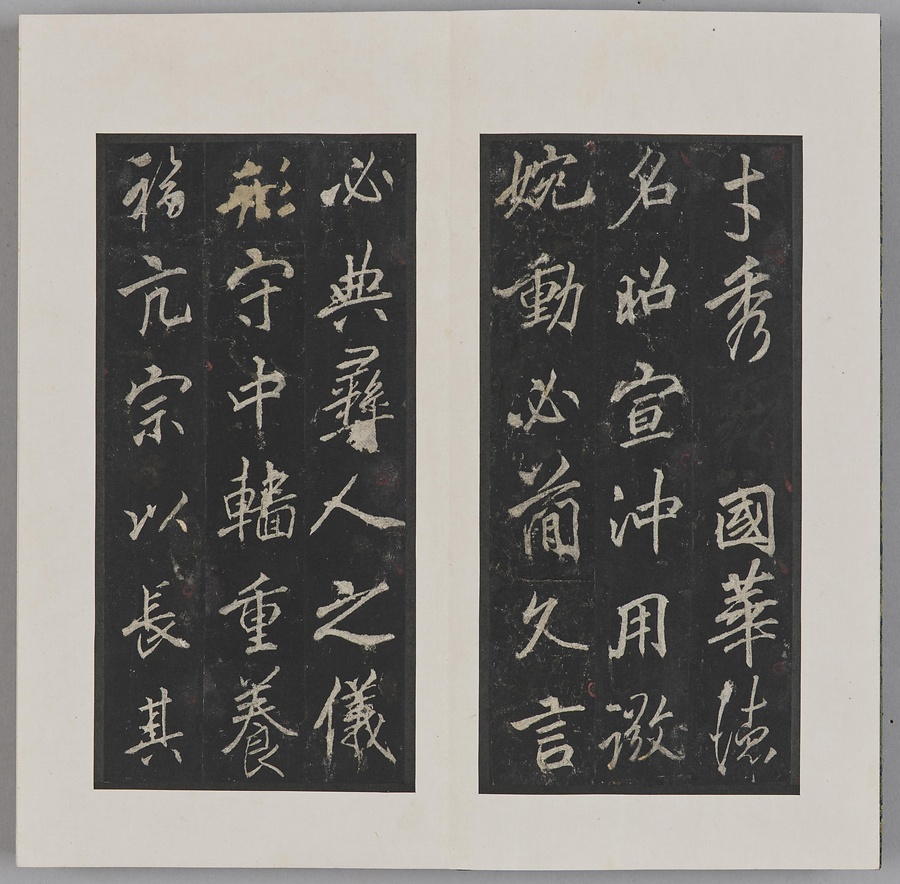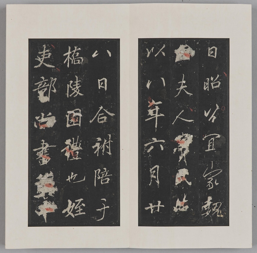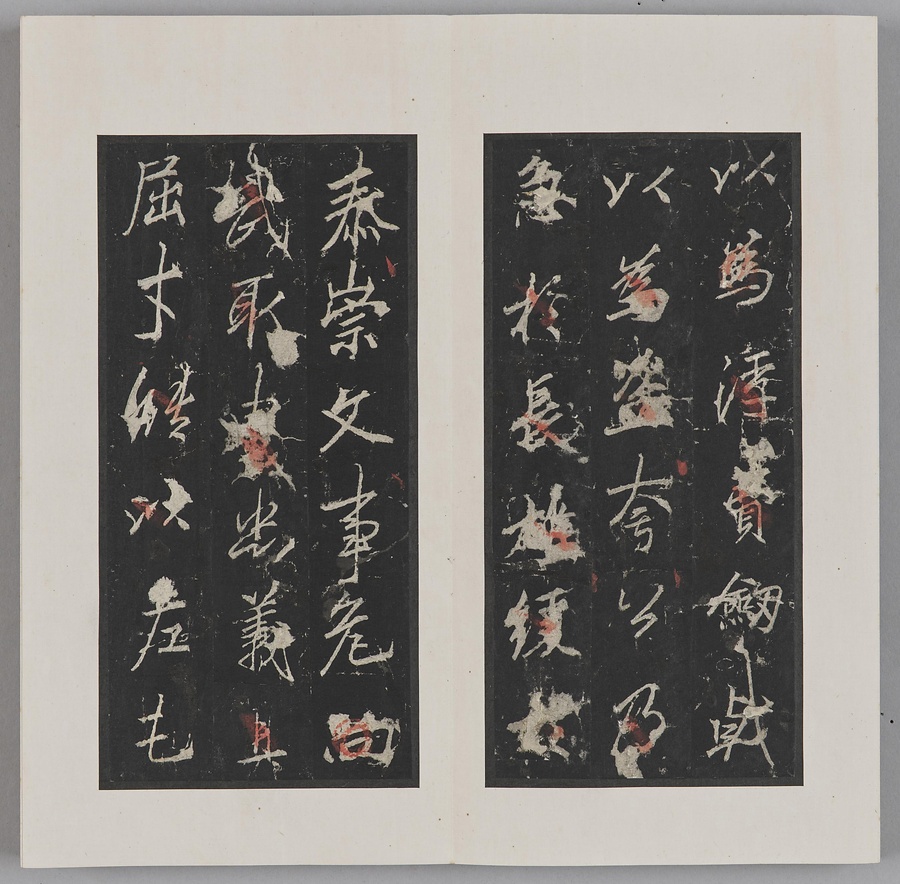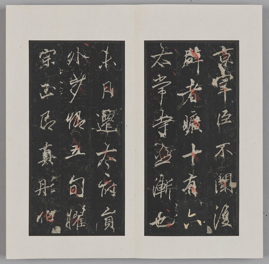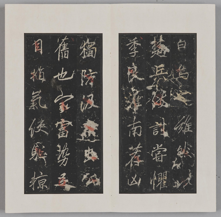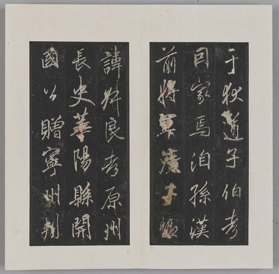 李思訓は唐の宗室の出身で、画家として名高く、後世、北宗画@ほくしゅうが@の祖と仰がれました。李邕は官僚で文章と書法に優れ、とりわけ墓碑の銘文を得意としました。本碑は李邕の行書碑の代表作で、碑石は李思訓の埋葬地の陝西@せんせい@省蒲城@ほじょう@に現存します。豪放な筆使いで、横画は右上がりが強く、躍動感に富む字姿です。