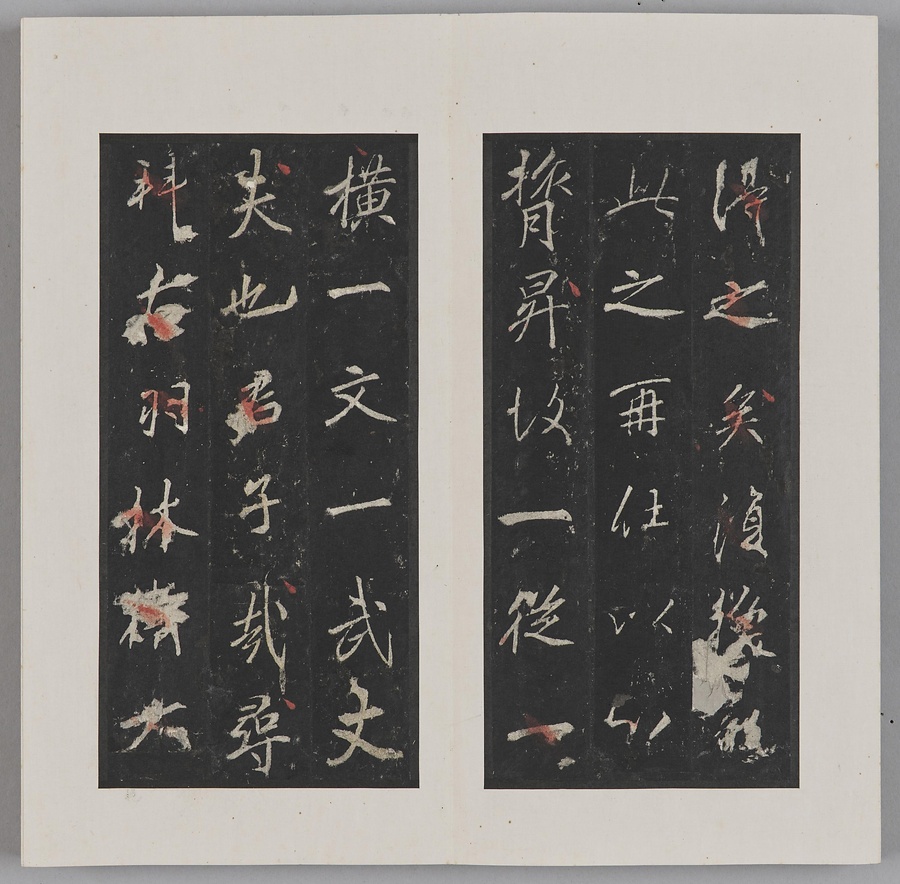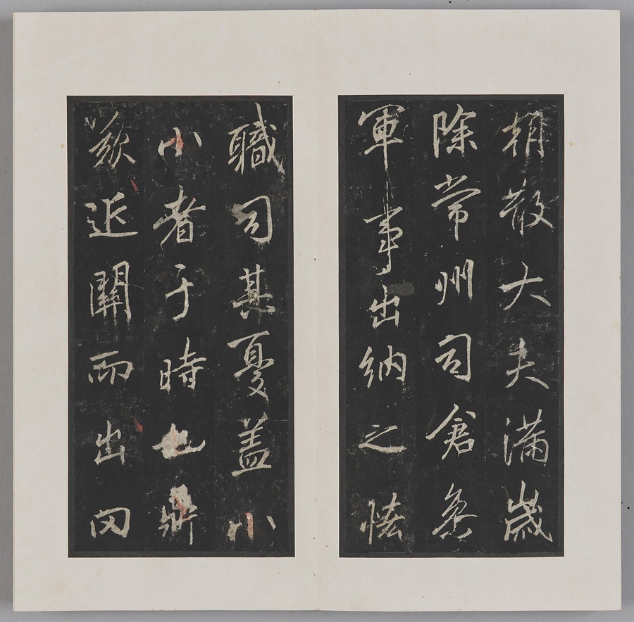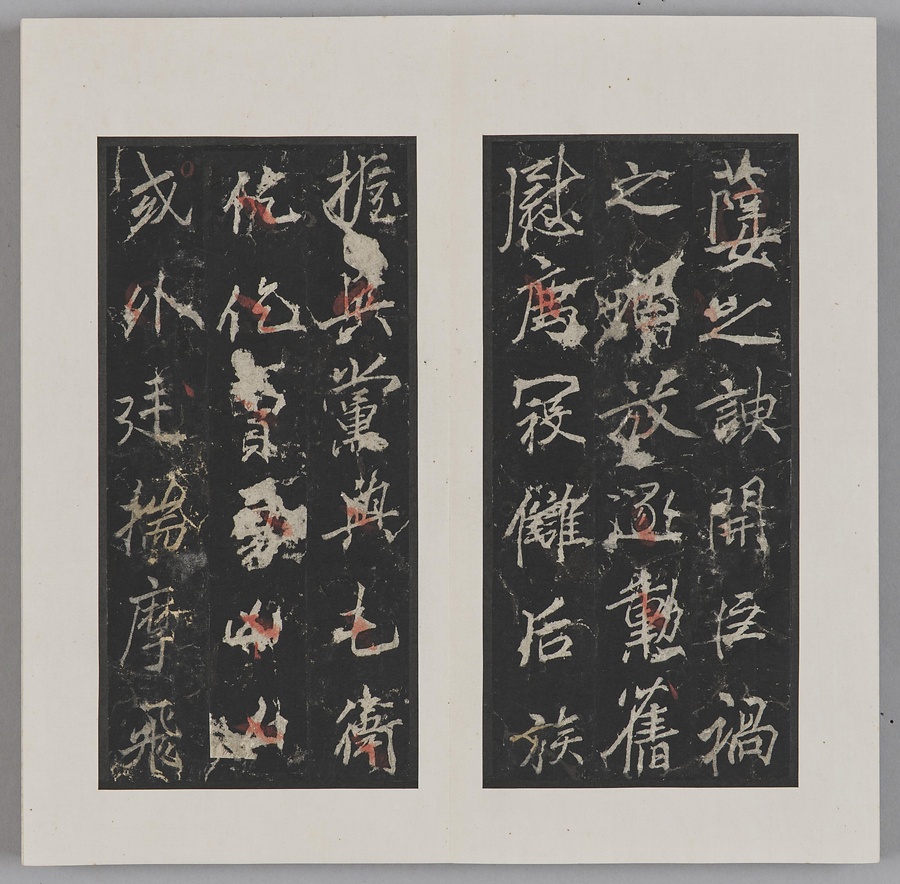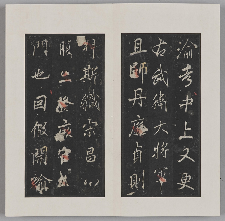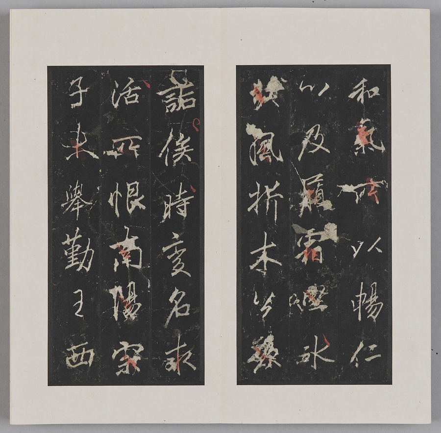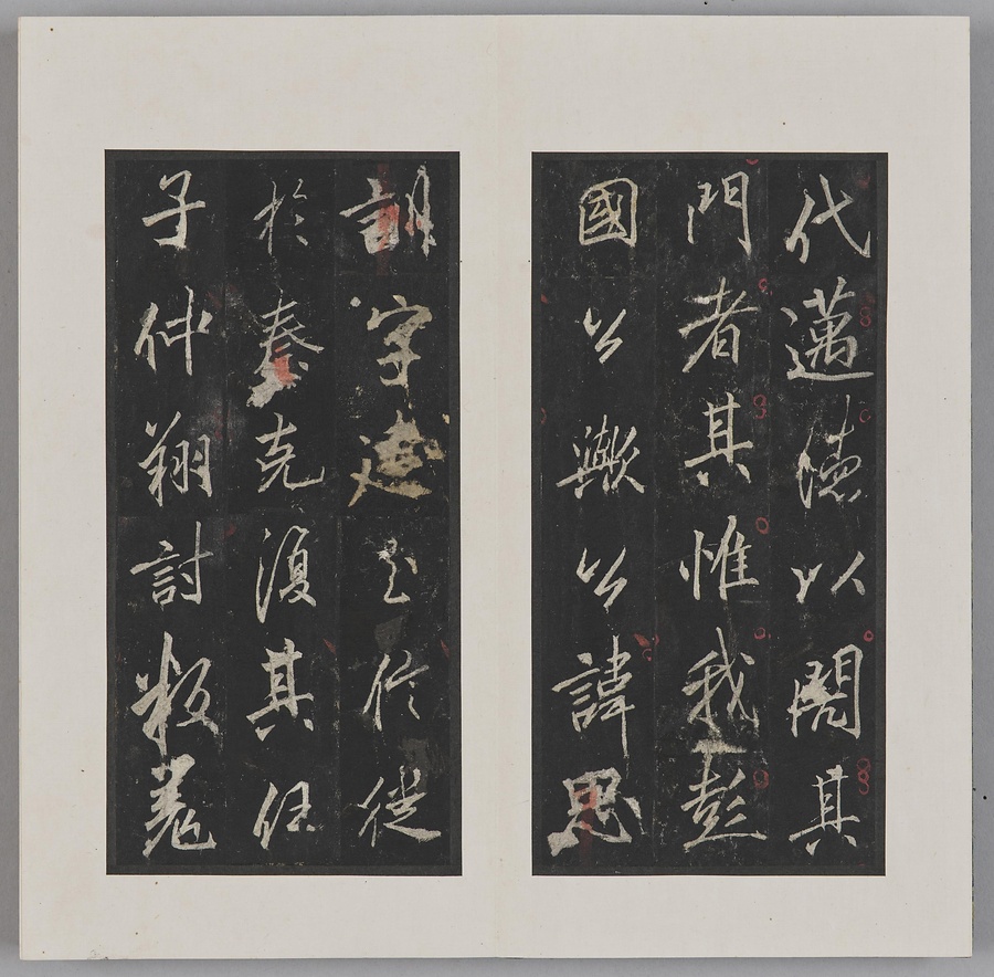 李思訓は唐の宗室の出身で、画家として名高く、後世、北宗画@ほくしゅうが@の祖と仰がれました。李邕は官僚で文章と書法に優れ、とりわけ墓碑の銘文を得意としました。本碑は李邕の行書碑の代表作で、碑石は李思訓の埋葬地の陝西@せんせい@省蒲城@ほじょう@に現存します。豪放な筆使いで、横画は右上がりが強く、躍動感に富む字姿です。
