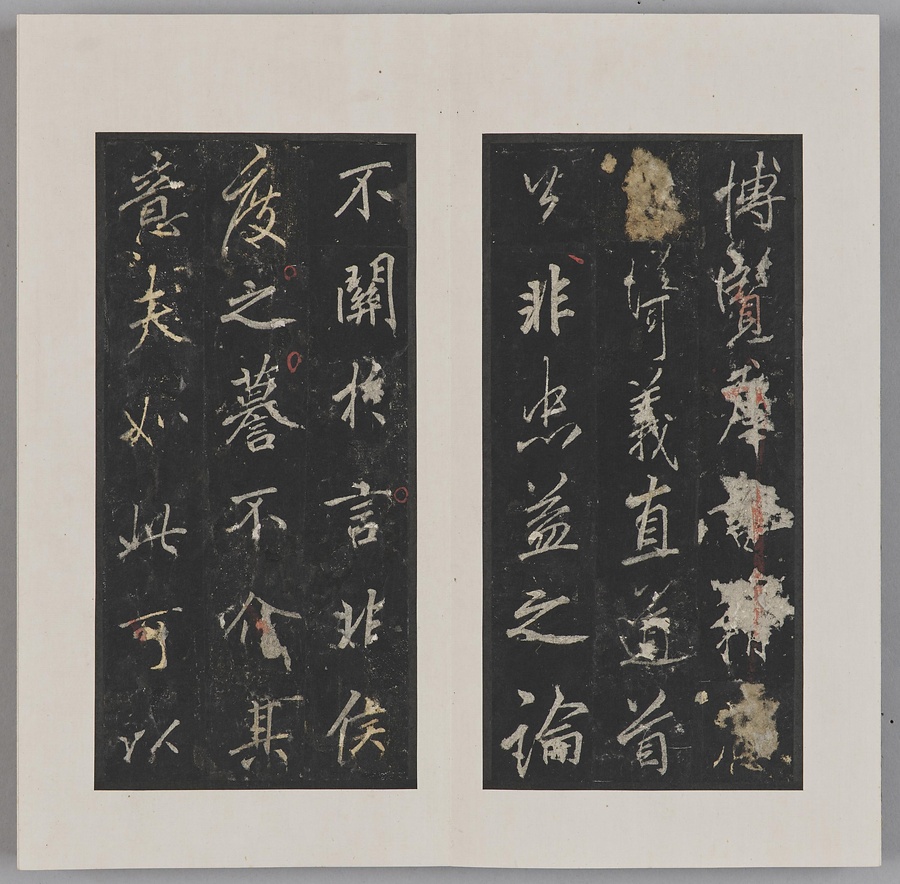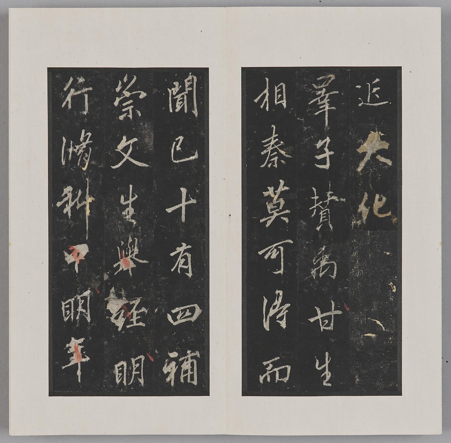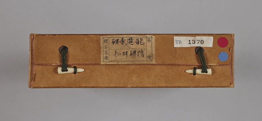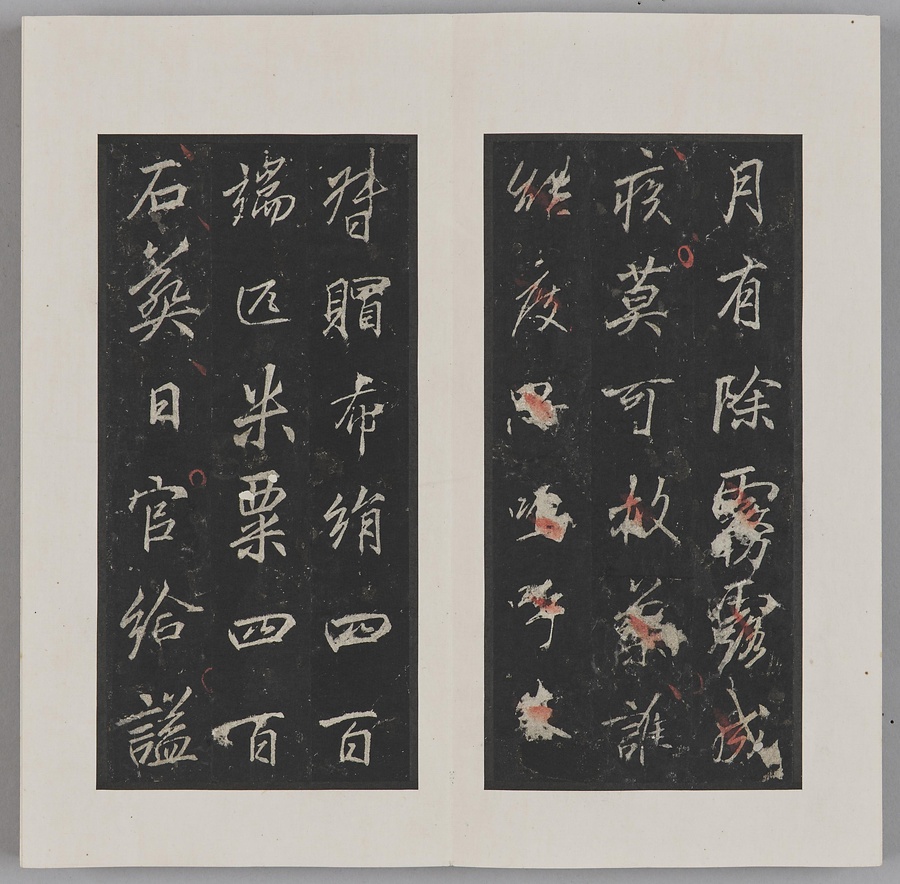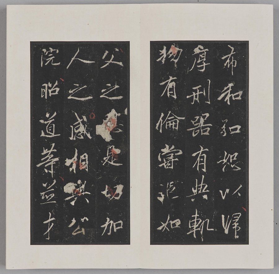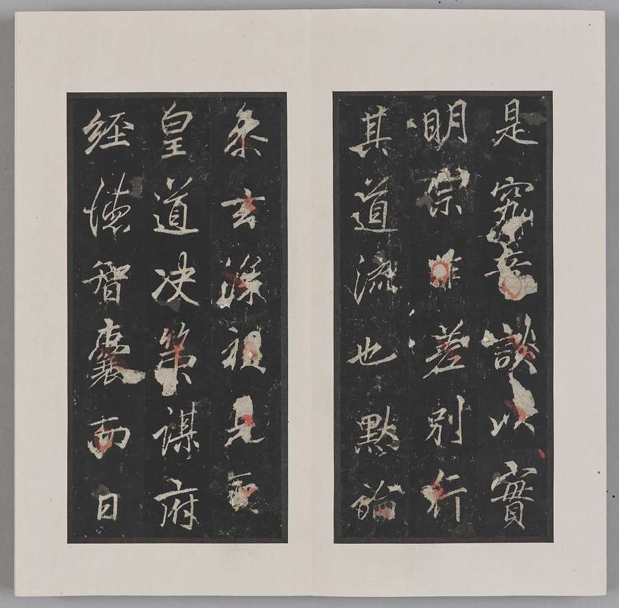 李思訓は唐の宗室の出身で、画家として名高く、後世、北宗画@ほくしゅうが@の祖と仰がれました。李邕は官僚で文章と書法に優れ、とりわけ墓碑の銘文を得意としました。本碑は李邕の行書碑の代表作で、碑石は李思訓の埋葬地の陝西@せんせい@省蒲城@ほじょう@に現存します。豪放な筆使いで、横画は右上がりが強く、躍動感に富む字姿です。