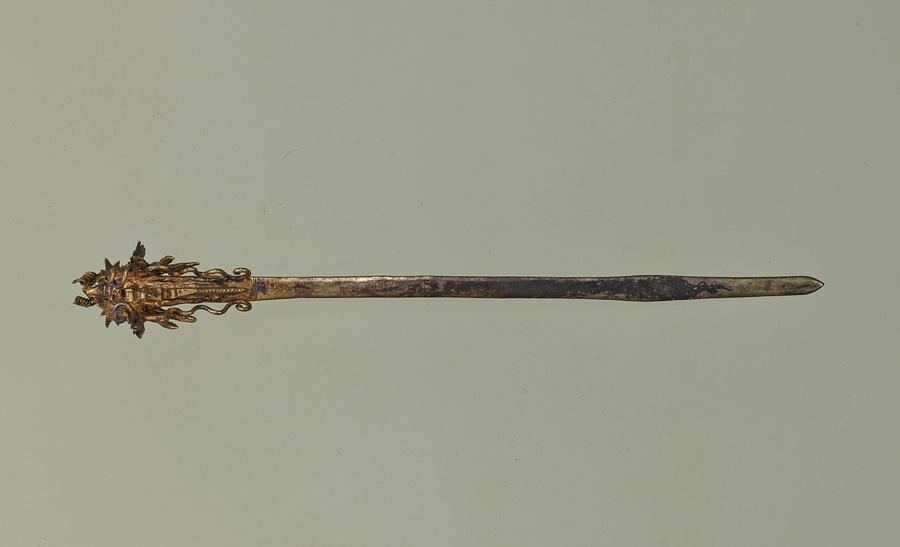 飾りに龍の首をつけ、簪+かんざし+に唐草+からくさ+文様などを打ち出したものです。差込部分は平らに仕上げられるなど、一般的にみられる女性用の簪とは異なった形です。本例は伝世品が少なく、そのため、いつ、だれがどういう時に使ったかはわかっていません。