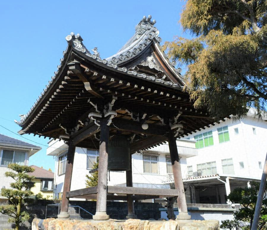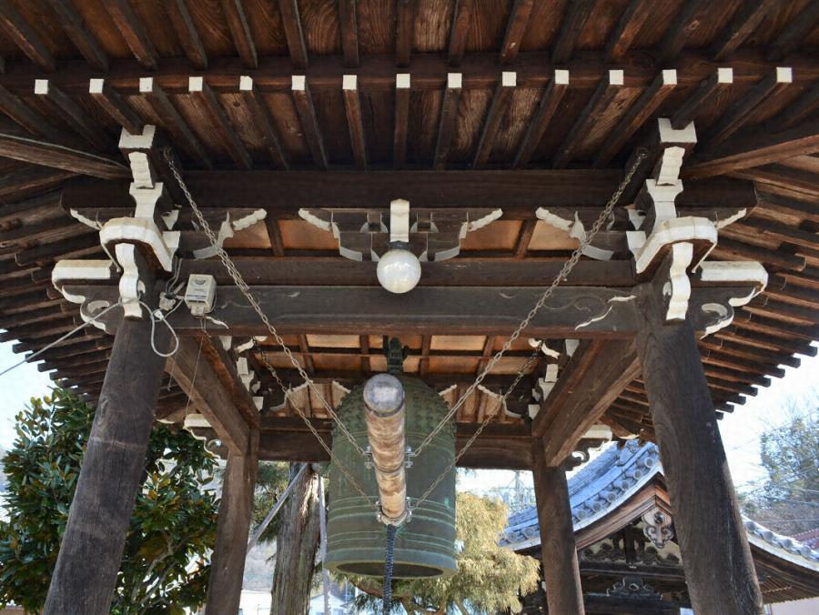 百々ヶ峰を背に山門と並ぶ浄土真宗寺院の鐘楼。入母屋造桟瓦葺、二軒、三斗組、格天井を張る。乱石積基壇に、内転びの礎盤付円柱を貫・虹梁・頭貫で固めた方一間吹放ちとする。本堂棟梁の弟子の作で、地元大工の仕事ぶりを伝え、歴史的な伽藍景観を形成。