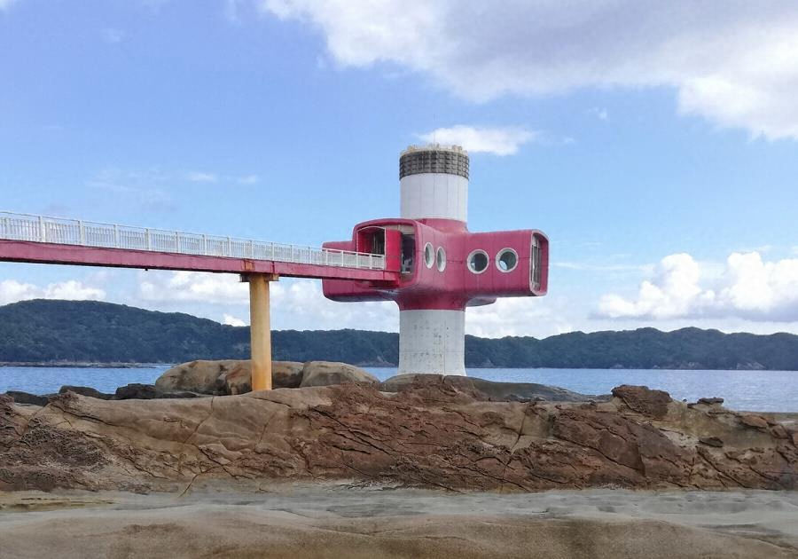 竜串海域公園に築かれた海中展望塔。円筒形塔部と十字形平面の展望室を、H型鋼と外殻板等の全溶接で一体化した鋼構造物。海岸とは連絡橋で接続。丸窓を多用し、頂部にアクリルブロックを廻らす。自然美の中で異彩を放つ近未来的デザインの海洋レジャー施設。