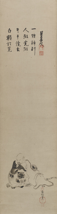 虎に寄りかかり眠る中国唐時代の僧・豊干(ぶかん)の姿を簡潔な墨線で描いた作品。豊干は禅の境地の象徴として好まれた画題で、寒山(かんざん)や拾得(じっとく)を伴って眠る「四睡図」なども盛んに描かれた。益信は探幽の養子で駿河台狩野家の祖。賛者の翠巌宗珉(すいがんそうみん)は大徳寺195世住持。