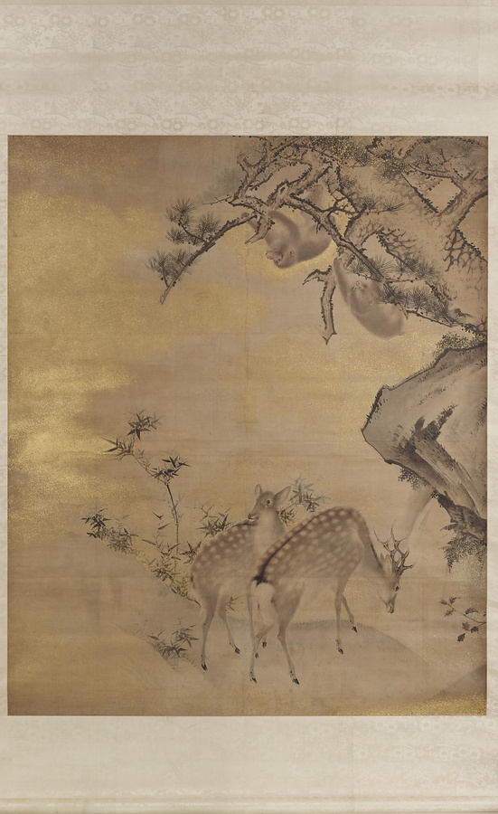 この作品には、左右の画面を横断する、大きな枝ぶりの松をはさんで、右に猿、左に鹿が描かれています。松の枝や背景の岩を描くごつごつとした輪郭線のタッチとは対照的に、猿や鹿は細い描線で一本一本の毛を描き、動物の柔らかい毛並みを表現しています。この絵の筆者の森狙仙は、江戸時代後期に大坂で活躍した画家です。綿密な観察に基づいて動物を描くことで、独自の画風をつくりあげました。なかでも猿の毛並みの表現は評判で、「狙仙の猿」と言われるほどでした。たしかに、さわった時の柔らかな毛の感触がリアルに想像できるような表現です。実は、この作品は、もともと床の間の大きな壁の絵であったものが、掛軸に仕立て直されたと考えられています。鹿は秋を示すモチーフです。他の壁や襖にも紅葉などが描かれ、部屋全体に秋の自然の風景が広がっていたかもしれません。こうした画題から、それほど格式張った部屋ではなく、ゆるやかに和むことのできる客室のような場所にあったと想像されます。