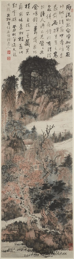 康煕2年(1663)の秋、天龍古院を訪れた際に、山中に幽栖し閑適する人物を描いたものです。髡残は石渓の号で知られ、南京を中心に活躍。明末から清初にかけての遺民画家の弘仁(漸江)、朱耷(八大山人)、道済(石涛)とともに四画僧と併称されます。