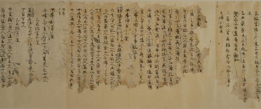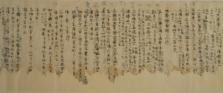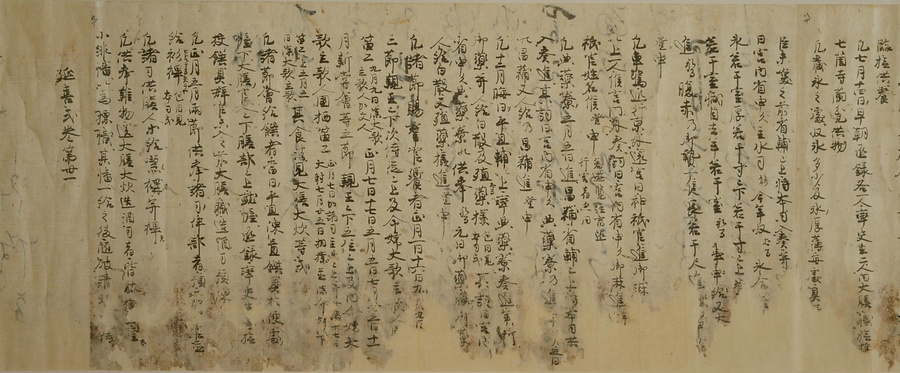 日本では7世紀の後半に、中国の例を学んだ法律が取り入れられました。それを律令(りつりょう)といいます。律は犯罪を罰する刑法、令はそれ以外の法律を指す言葉です。しかし、中国にならった律令は、日本の実情に合わない部分も多く、それを補うために出された法律を格(きゃく)といいます。そして、この律・令・格を実際に運用するうえで必要になる細かな規則を式と呼びます。平安時代において、この式は社会の変化に合わせてたびたび改められ、補われました。その中でも、延喜5 (905) 年に、醍醐(だいご)天皇の命令によって編集を開始したのが延喜式です。これ以前の式は一部しか残っていませんが、延喜式はほぼ完全な形で伝えられている点で重要な史料です。