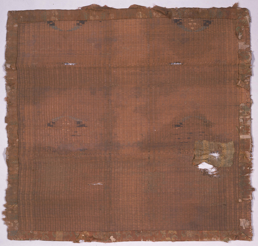 藺草(いぐさ)で編んだ藺筵(いむしろ)です。筵には染めた藺草によって文様を表わし、麦稈(麦わら)を編み込んだ部分が光ってみえます。奈良・斑鳩の法輪寺にも、伝推古天皇所用の重要文化財「龍鬢褥(りゅうびんじょく)」があり、本品とともに日本古代の藺筵を伝えています。本品の縁に回された花唐草文緯錦と浮文織は、典型的な中世日本の錦です。後世にその形を整えながら、法隆寺で大切に伝えられてきたことが分かります。