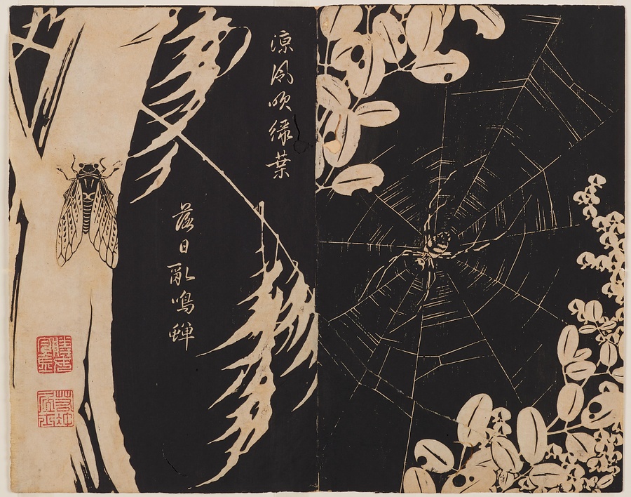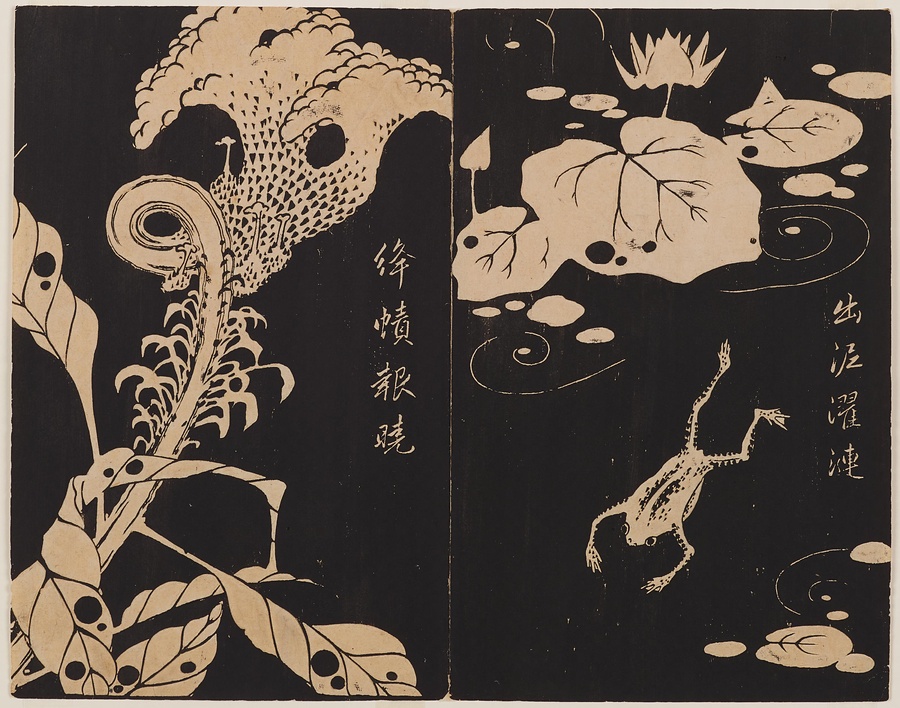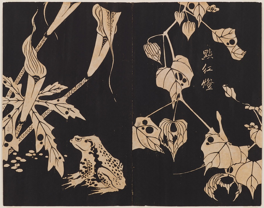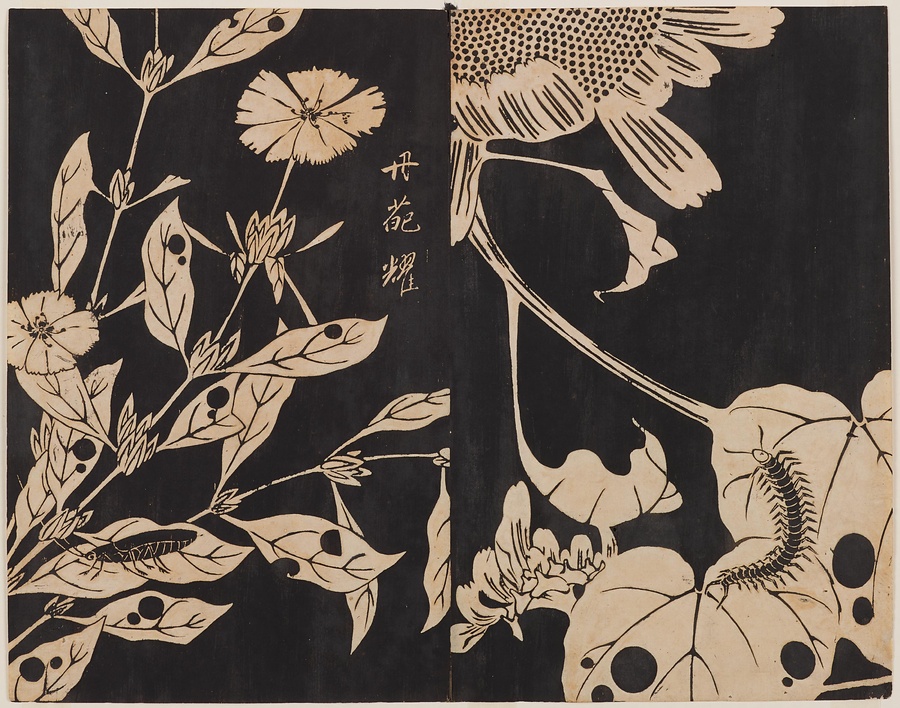 「玄圃瑤華」の「玄圃」は仙人の居どころ、「瑤華」は玉のように美しい花の意味。拓本のように紙の表側から墨を打って形を出す若冲が得意とした版画技法で、草花と虫、野菜などが描かれます。白と黒の劇的なコントラストと大胆な構図が見どころ。若冲53歳の時の作品です。