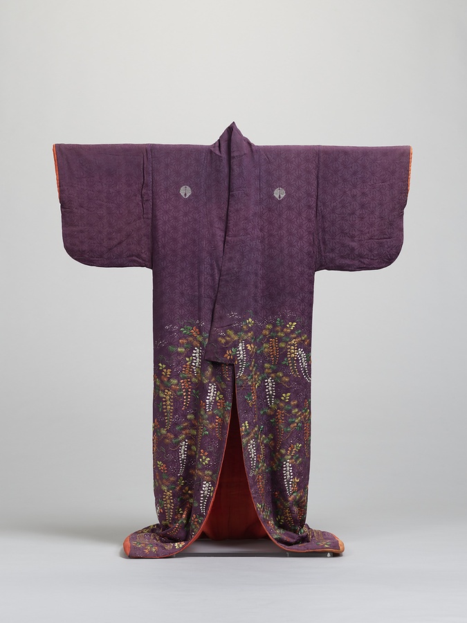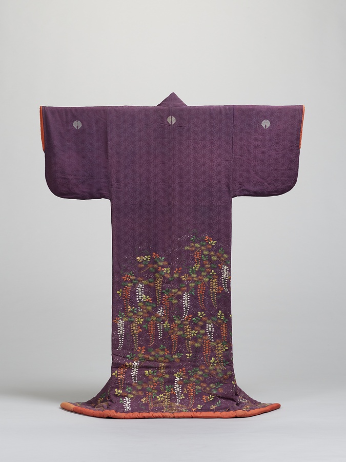 江戸後期の武家女性の小袖。紫の紋縮緬地に王朝文様や文芸意匠などのいわゆる御所解文様を素繍で表現している。刺繍で王朝文様や文芸意匠を表す小袖は江戸後期に盛んに製作されたが、綸子地や紗綾地が多く、本品のように紋縮緬を用いる例は珍しい。また袖が丸く、身八つ口がない形状は古様を示す。類例の中でも古い例であると考えられる。五つ紋には絓繍いによる抱き杏葉紋が入る。杏葉には縦筋が表現されており、鍋島本家の家紋と共通する。汀に立つ松に蔓を絡ませ咲き乱れる藤花の図様からは、能「藤」が想起される。