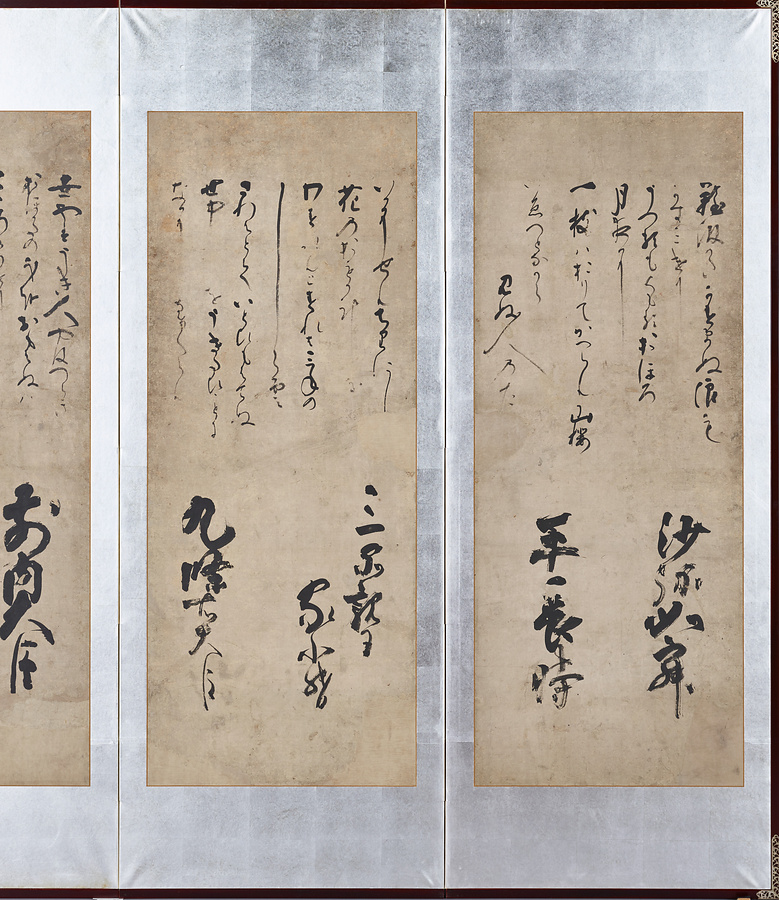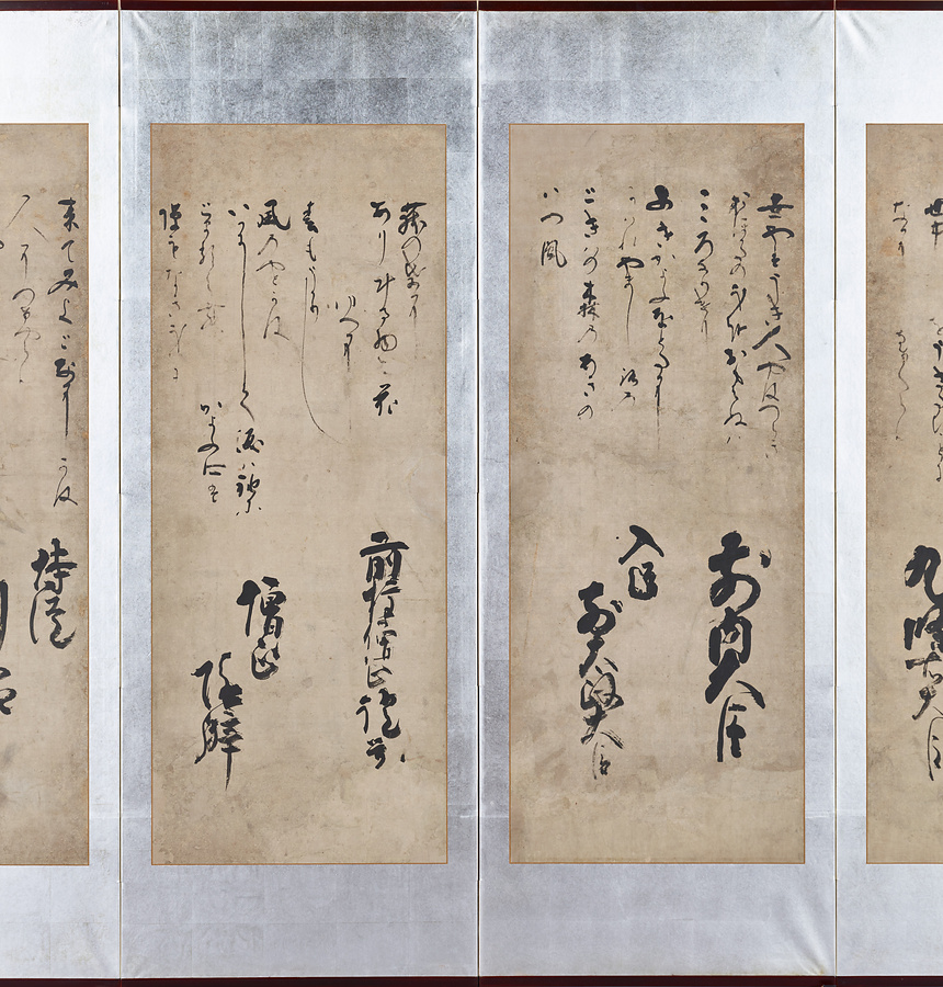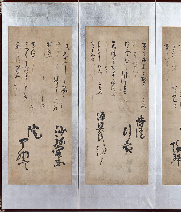 力強く抑揚のある筆致と墨の潤渇@じゅんかつ@が、紙面にコントラストと奥行きを与えています。右隻に漢語・漢詩を、左隻に『三十六人大歌合』より和歌と作者を揮毫@きごう@しています。各第六扇に捺@お@された「春深」「道朝」「阿闍梨道朝」の朱印から、表野家出身で高野山の僧・春深@しゅんしん@の書とわかります。