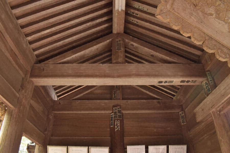 神社創建に際して唐沢山山頂に御霊代上屋と共に建てた社殿。切妻造平入銅板葺、二軒繁垂木、正面吹放ち、側面及び背面両脇間を板壁として、背面中央に板扉を吊る。床は四半石敷。当初は門と拝殿を兼ねた役割で、柱は節が多く、創建時の歴史を伝える。