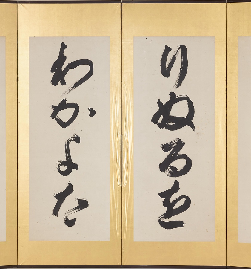 貫名菘翁は、巻菱湖@まきりょうこ@・市川米庵@いちかわべいあん@とともに「幕末の三筆」として知られ、画は狩野派や南画などを学び、書は空海@くうかい@の大師流@だいしりゅう@や中国の晋@しん@・唐@とう@時代の法帖を学びました。これはいろは47字を揮毫@きごう@し、屏風に仕立てたものです。晩年の筆でありながら、躍動感あふれる雄渾@ゆうこん@な字姿をしています。