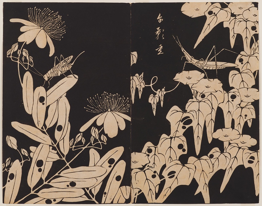 白と黒だけで、さまざまな草花、野菜、昆虫などが描かれています。作者は伊藤若冲。江戸時代中期(18世紀頃)、京都で活躍した画家です。花や鳥を描いた色鮮やかな絵画で知られますが、この作品のようなモノクロームの世界にも、グラフィカルなセンスが光ります。
