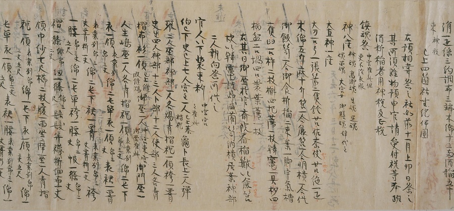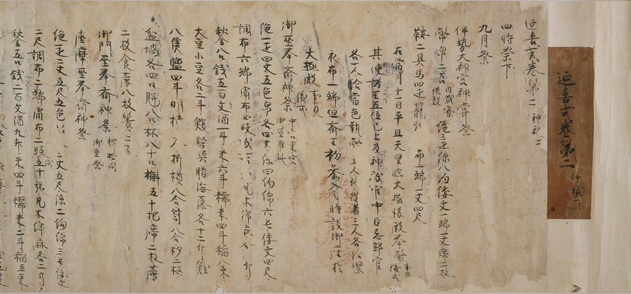 日本では7世紀の後半に、中国の例を学んだ法律が取り入れられました。それを律令(りつりょう)といいます。律は犯罪を罰する刑法、令はそれ以外の法律を指す言葉です。しかし、中国にならった律令は、日本の実情に合わない部分も多く、それを補うために出された法律を格(きゃく)といいます。そして、この律・令・格を実際に運用するうえで必要になる細かな規則を式と呼びます。平安時代において、この式は社会の変化に合わせてたびたび改められ、補われました。その中でも、延喜5 (905) 年に、醍醐(だいご)天皇の命令によって編集を開始したのが延喜式です。これ以前の式は一部しか残っていませんが、延喜式はほぼ完全な形で伝えられている点で重要な史料です。