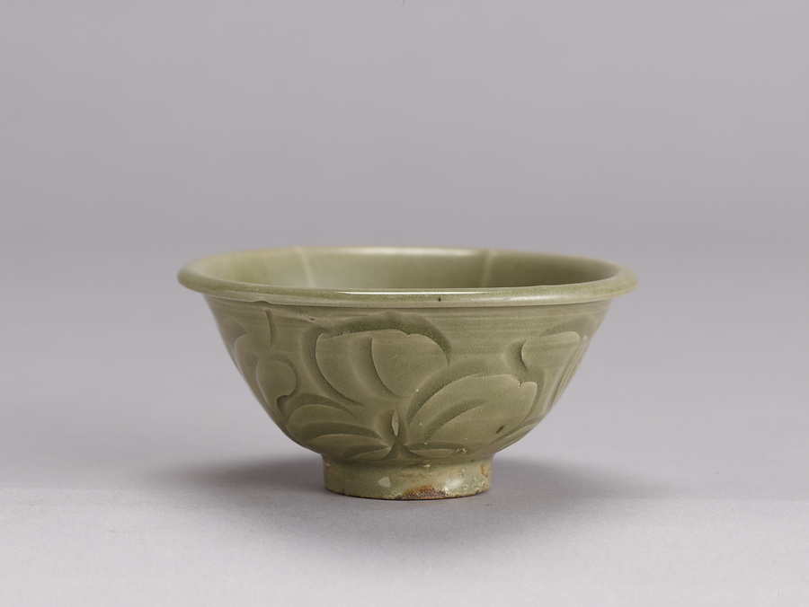 透明感のある緑色の釉が、削り出された部分に浅く深く溜まることによって、その濃淡が美しい青磁碗である。外面には片切り彫りによる牡丹文が描かれ、内面は素地の段階に沈線を施して輪花に仕上げている。陝西省耀州窯で焼かれたものである。
