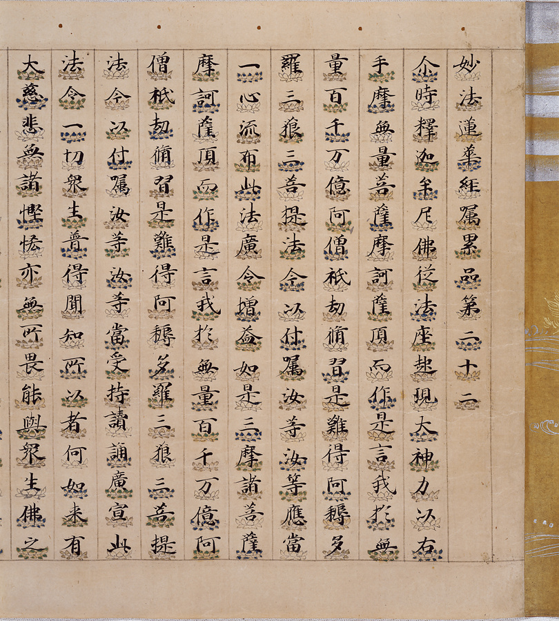 一字を一仏にみたて、彩色を施した蓮台の上に経文を一字ずつ乗せて書写した法華経。福島県の龍興寺の法華経九巻(開結共、巻第六欠)と一具のもので、平安時代後期に書写されたと考えられている。銀泥の界線をひき、蓮弁は、緑青・群青・朱・黄泥・金泥・銀泥などで彩色する。