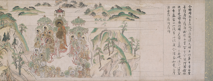 法華経絵巻は、法華経28品に説かれる内容を絵解風に描いたもので、もとは28品のすべてにわたっていたと考えられるが、現存するのは本図を含め3点(詞3段、絵4段)のみである。本図はこのうち、嘱累品(ぞくるいほん)の冒頭の絵1段にあたり、詞書は畠山記念館蔵本に残っている。図は霊鷲山で釈迦が聴聞の菩薩の頭をなで、法華経の弘宣を託す場面で、経文の一部が書き込まれている。筆者について、住吉慶恩との伝称があるが、真偽は別として鎌倉中期の絵仏師の手になるものと考えられる。