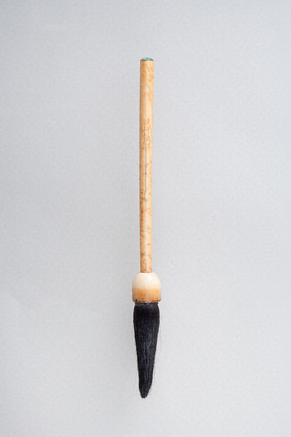 沈仁延銘象牙彫湖石花草人物図管提筆