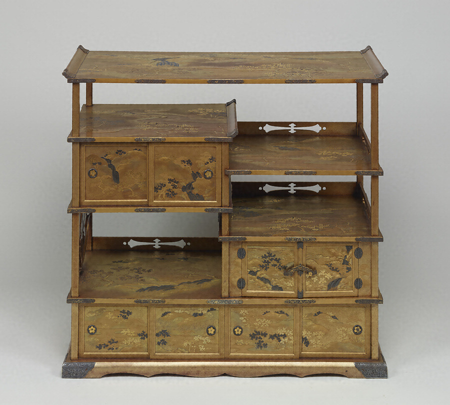 違棚を含めて五段の棚をもうけた大型の飾り棚。二の棚・五の棚に引き戸、四の棚に観音開きの扉を付ける。表面には金粉を密に蒔き付け、高蒔絵を主体にして吉野山の図を描く。金銀の金貝(かなかい)、金の切金(きりかね)など金属の薄板を貼る技法を交えて、桜花爛漫の山水を豪華に表わしている。