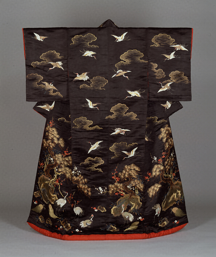 うちかけ くろしゅすじつるかめしょうちくばいもよう